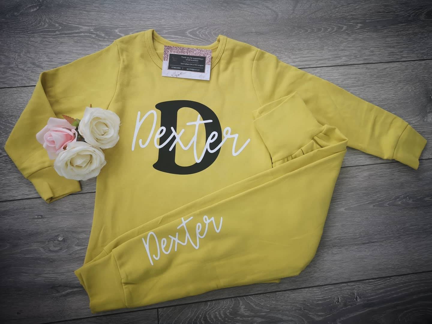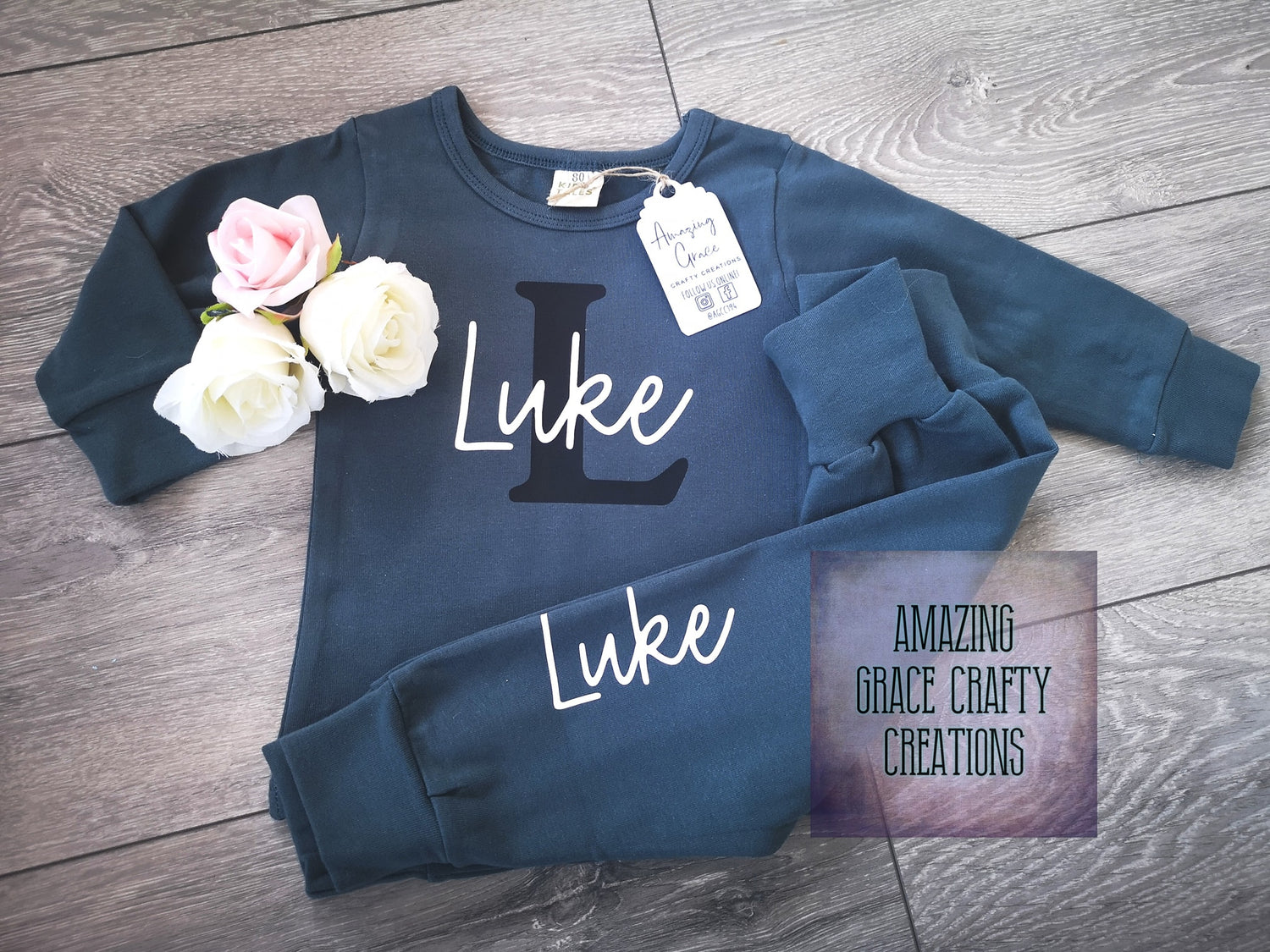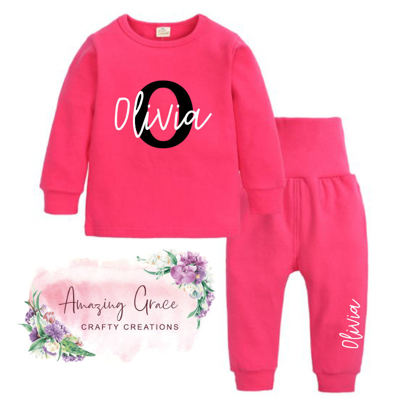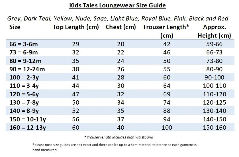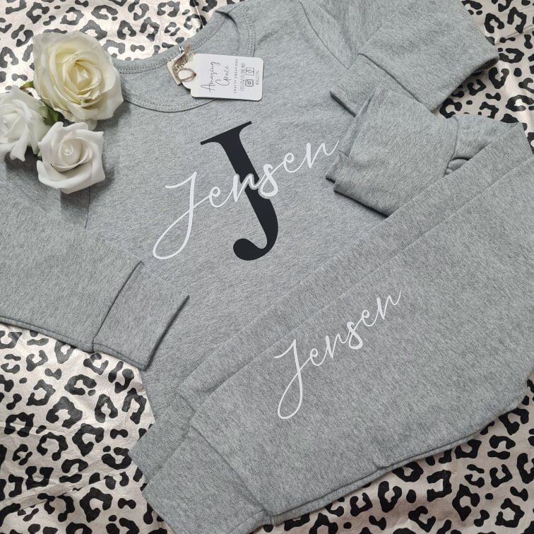 Stunning children's personalised lounge set available in a range of different colours and available in sizes from 3-6 months to 12-13 years. When sizing, please be aware that there is some stretch to the garment. Please check sizing chart