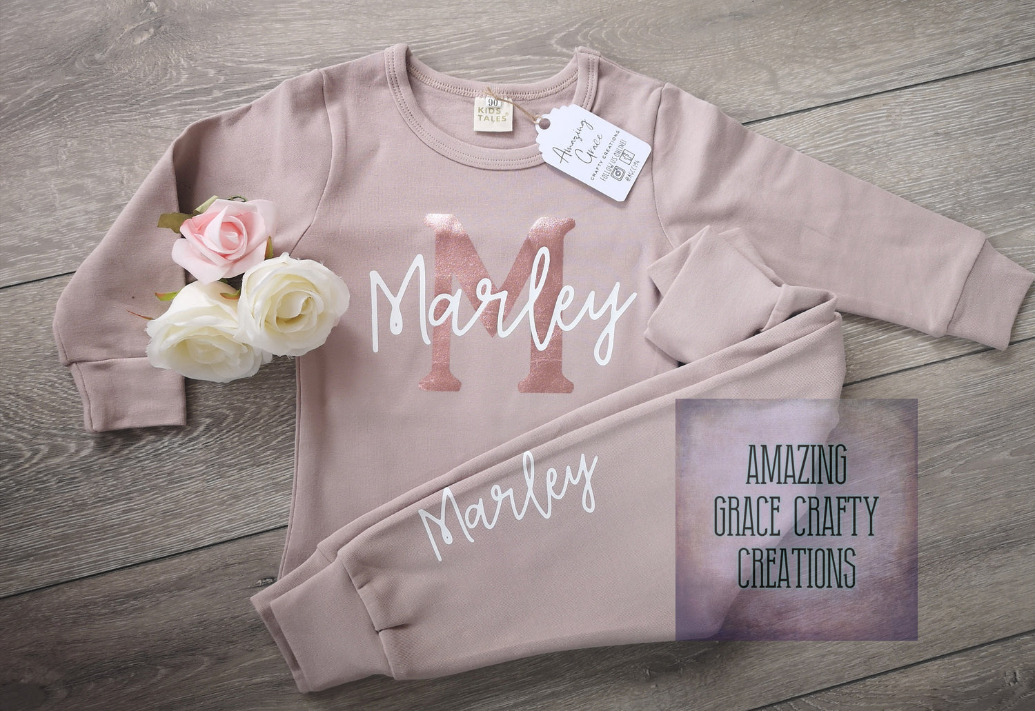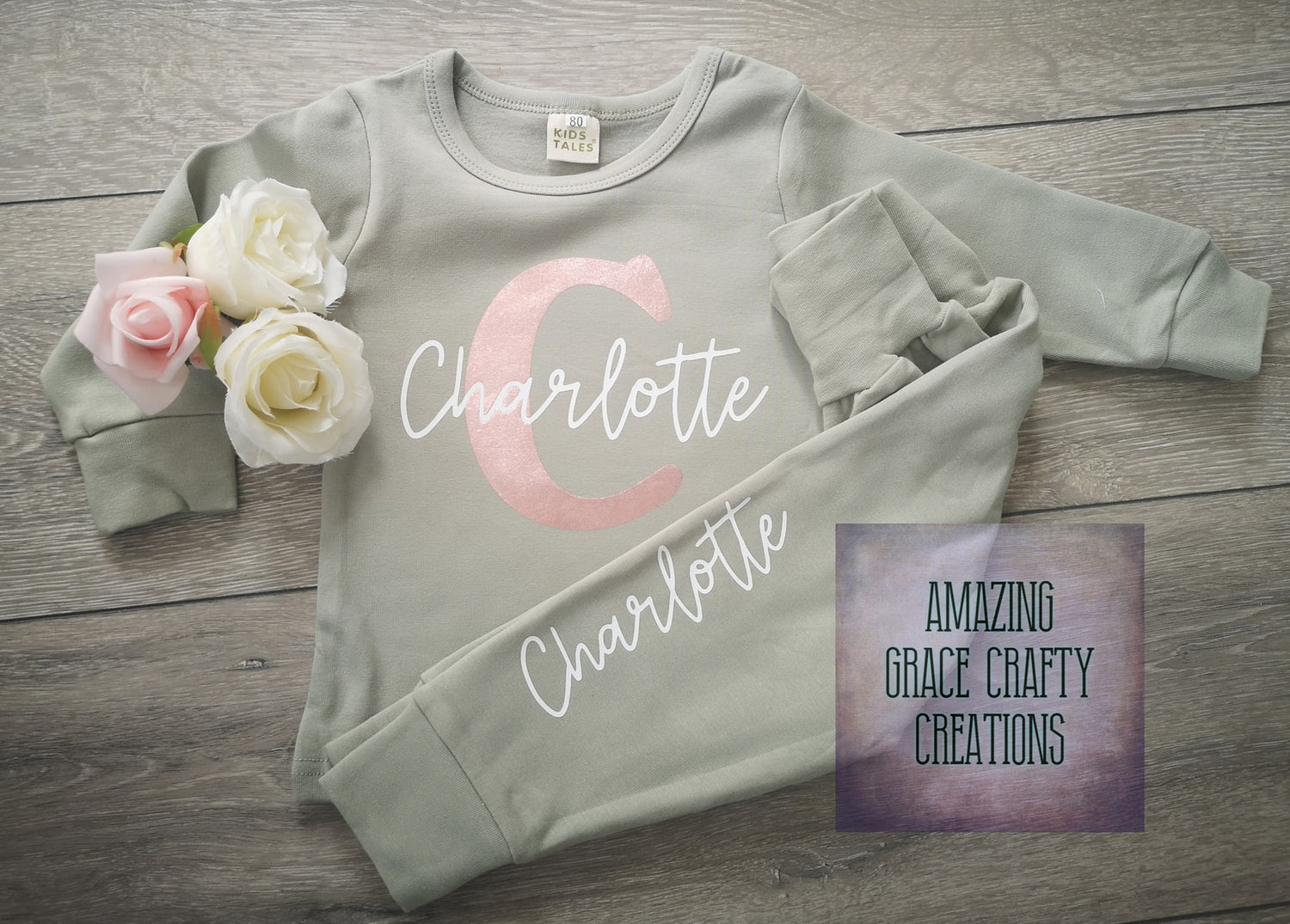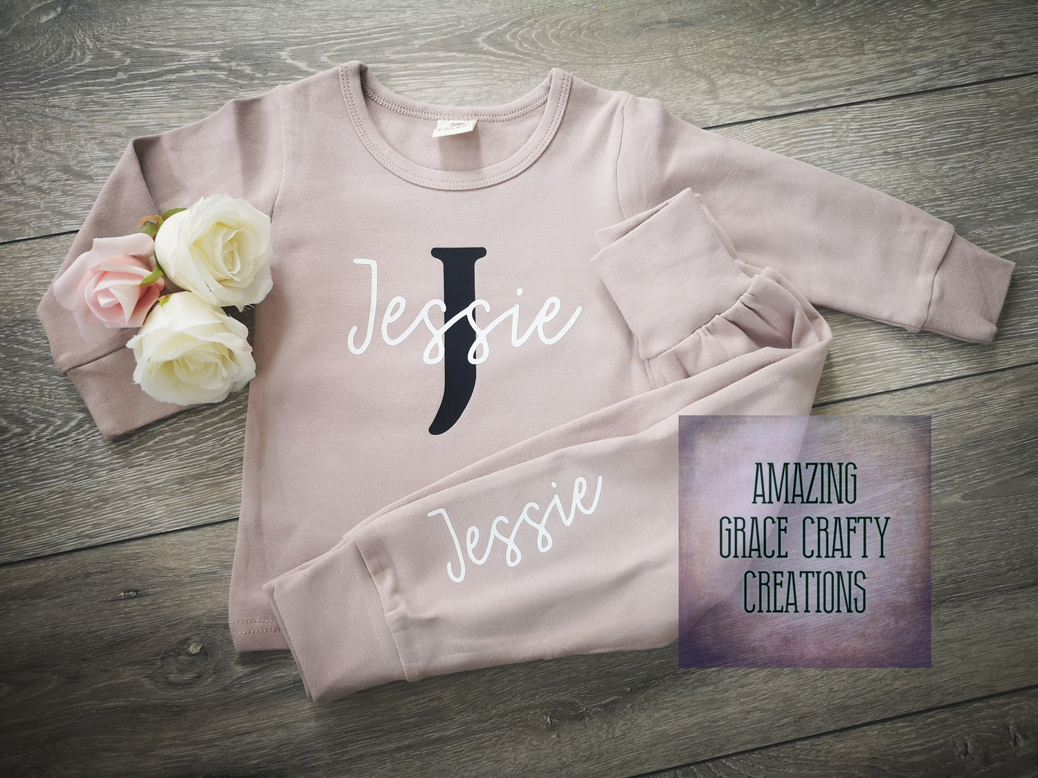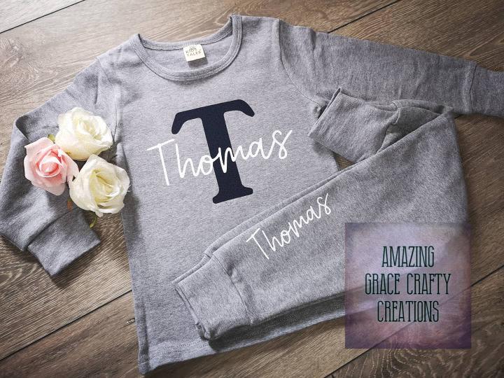 Stunning children's personalised lounge set available in a range of different colours and available in sizes from 3-6 months to 12-13 years. When sizing, please be aware that there is some stretch to the garment. Please check sizing chart