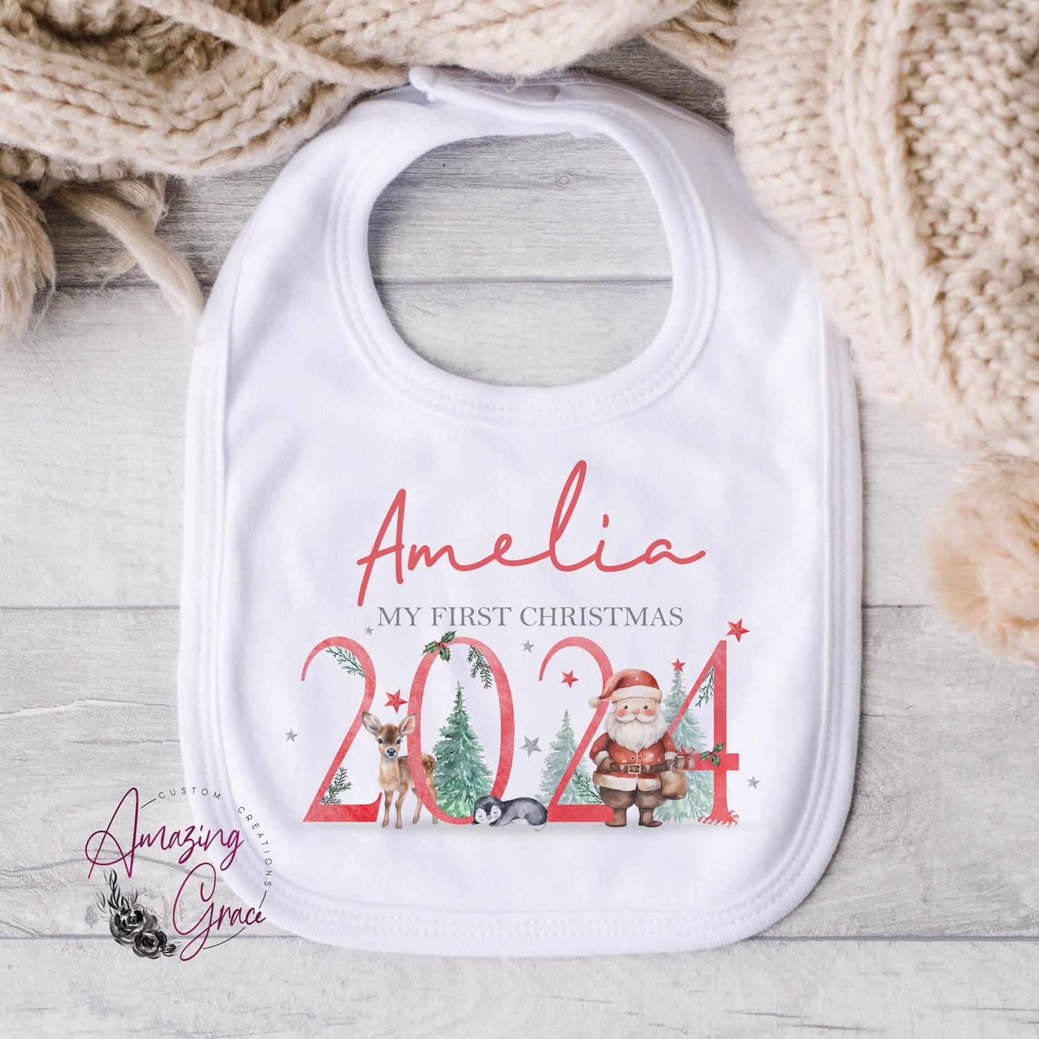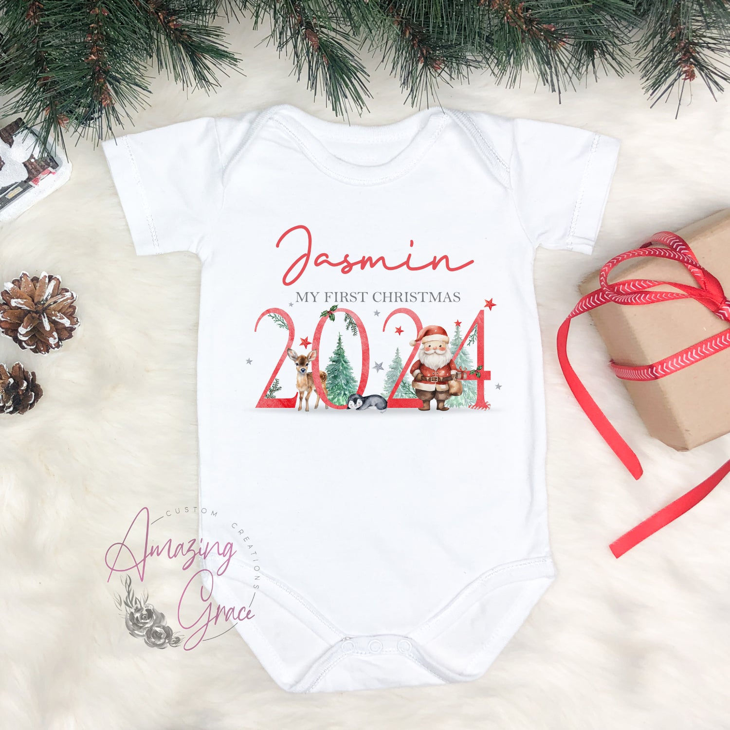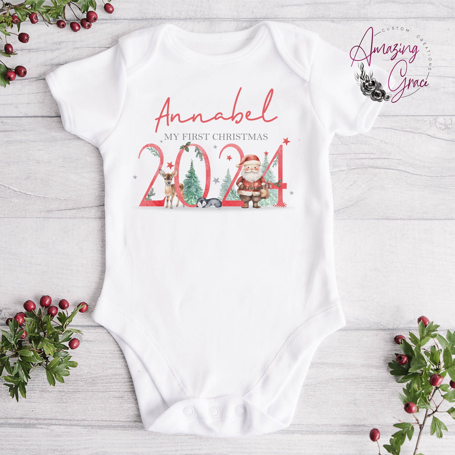 Beautiful soft touch vest or sleep suit with a stunning, unique "2024" design, personalised with your child's name to celebrate their first Christmas!