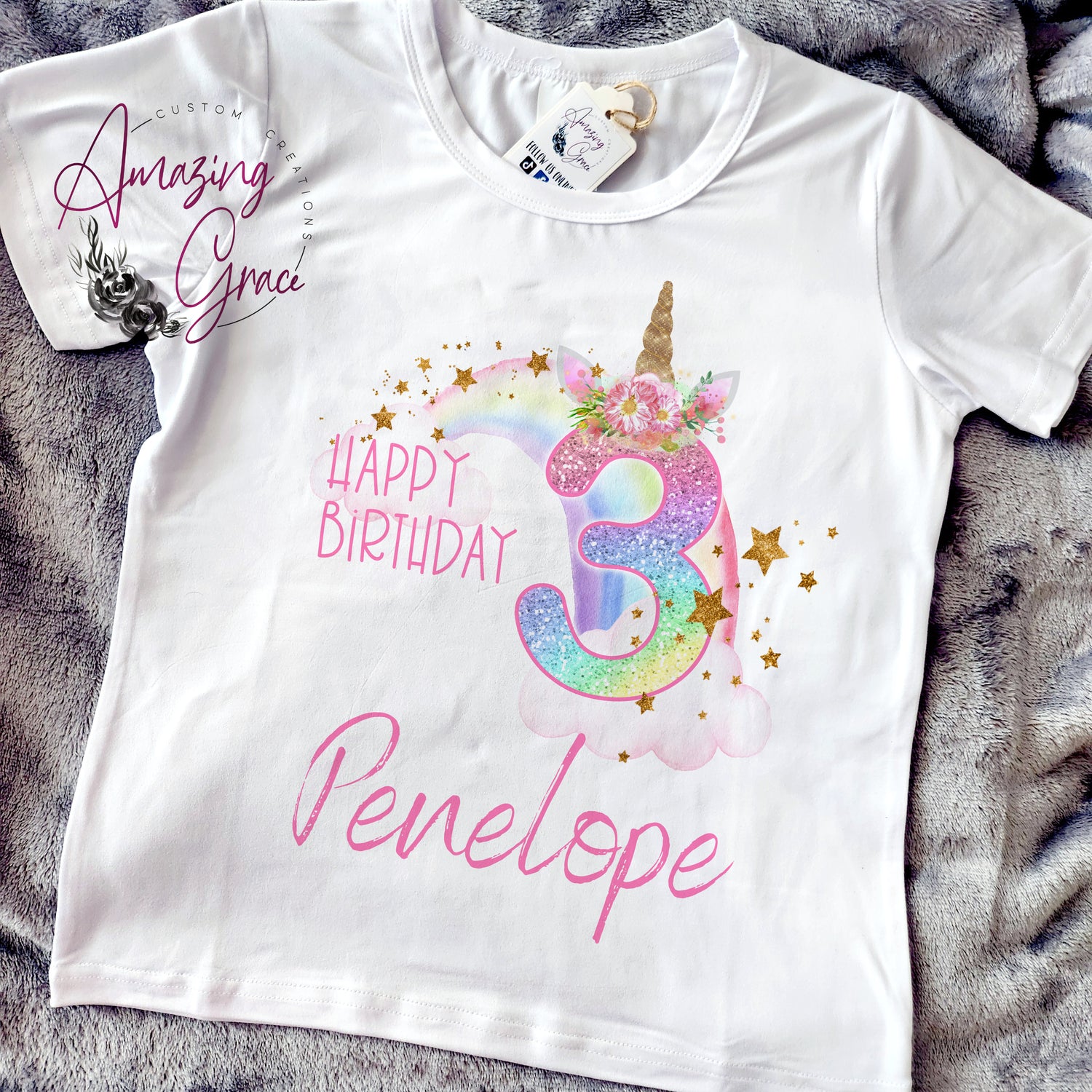 A new addition to our best selling t shirt range ! Feat. a gorgeous printed personalised rainbow unicorn design