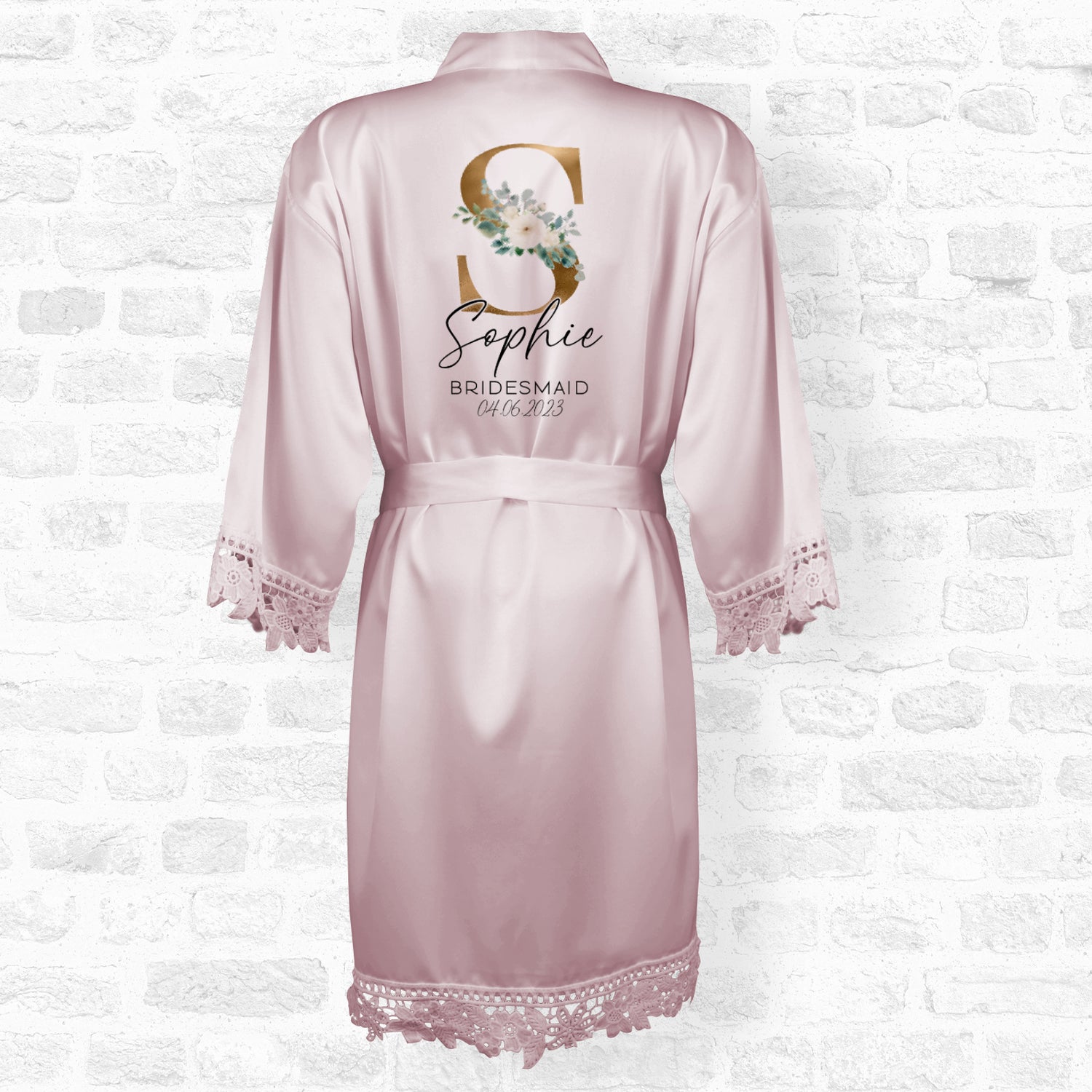 Stunning personalised robes, made using soft matt satin and include an inner waist tie, sash belt and belt loops and including floral gold letter artwork.