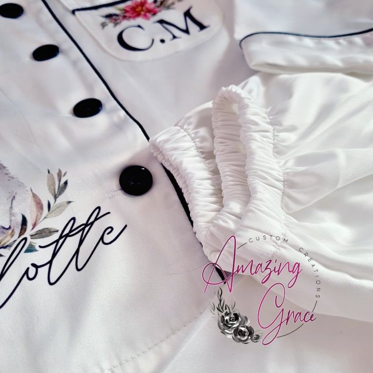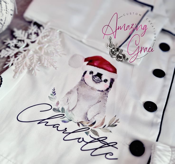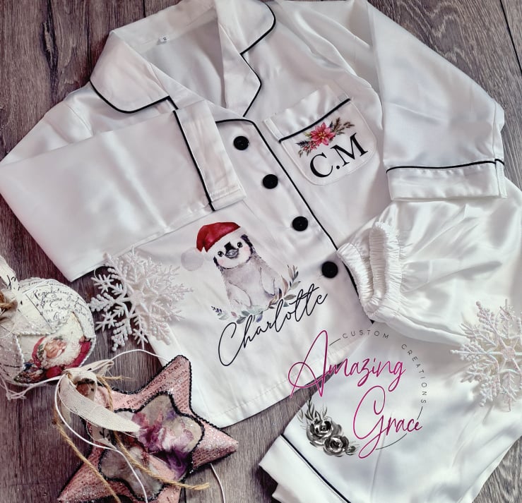 Stunning personalised Two piece long sleeved pyjama set, made using soft matt satin , including festive design and personalisation on the front and initials on the breast pocket