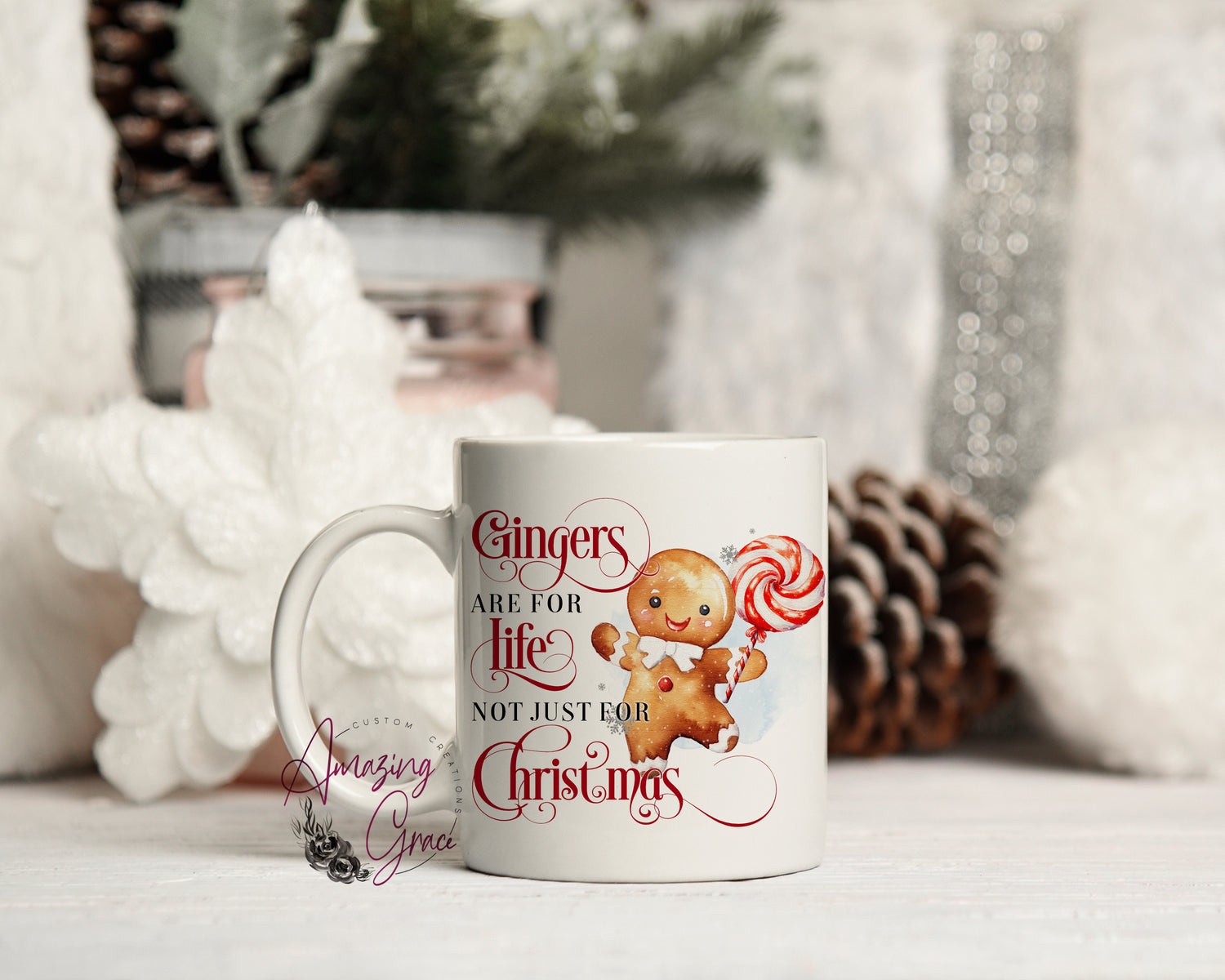 Ceramic mug decorated with cute gingerbread print and text, printed both sides