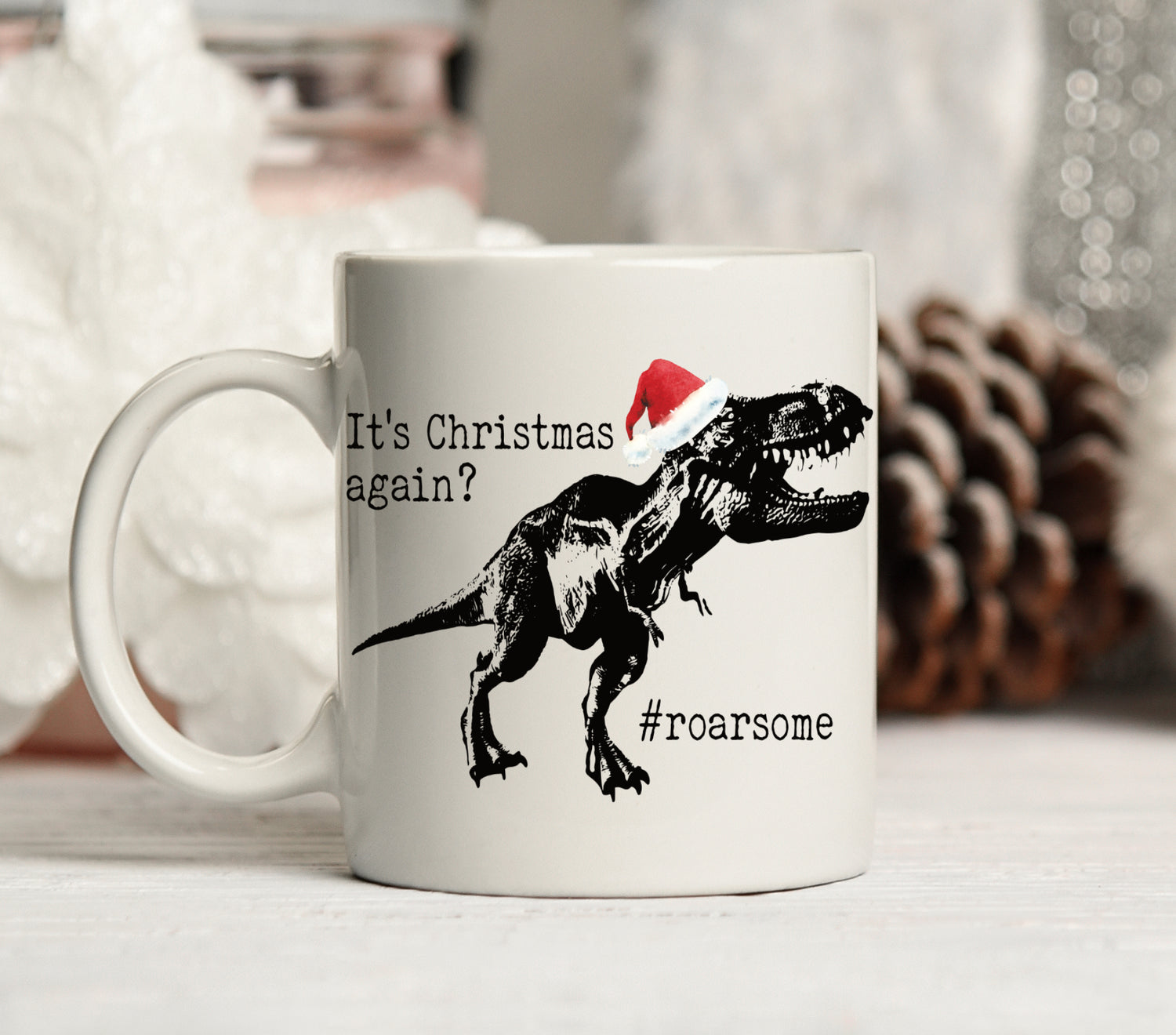 Ceramic mug decorated with T-rex print and text, printed both sides