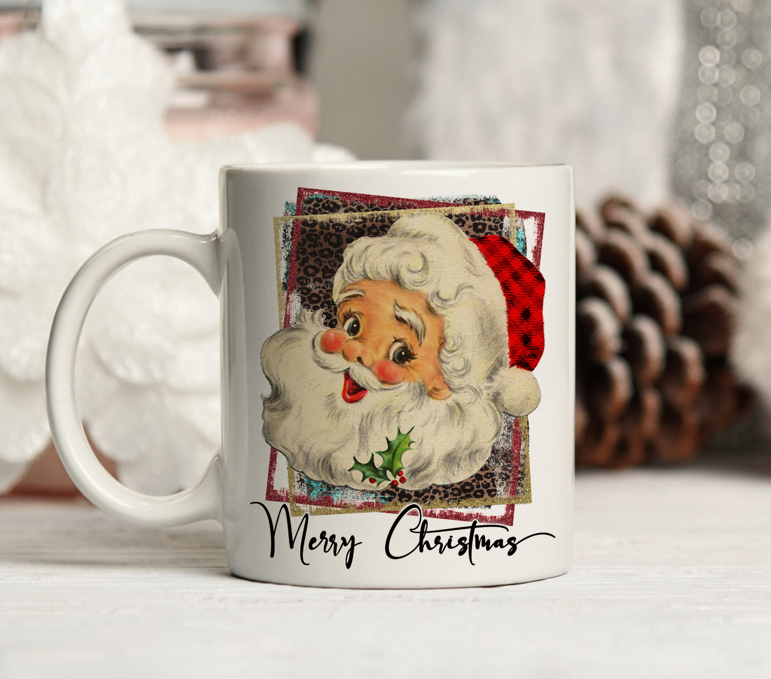 Ceramic mug decorated with vintage santa print and text, printed both sides