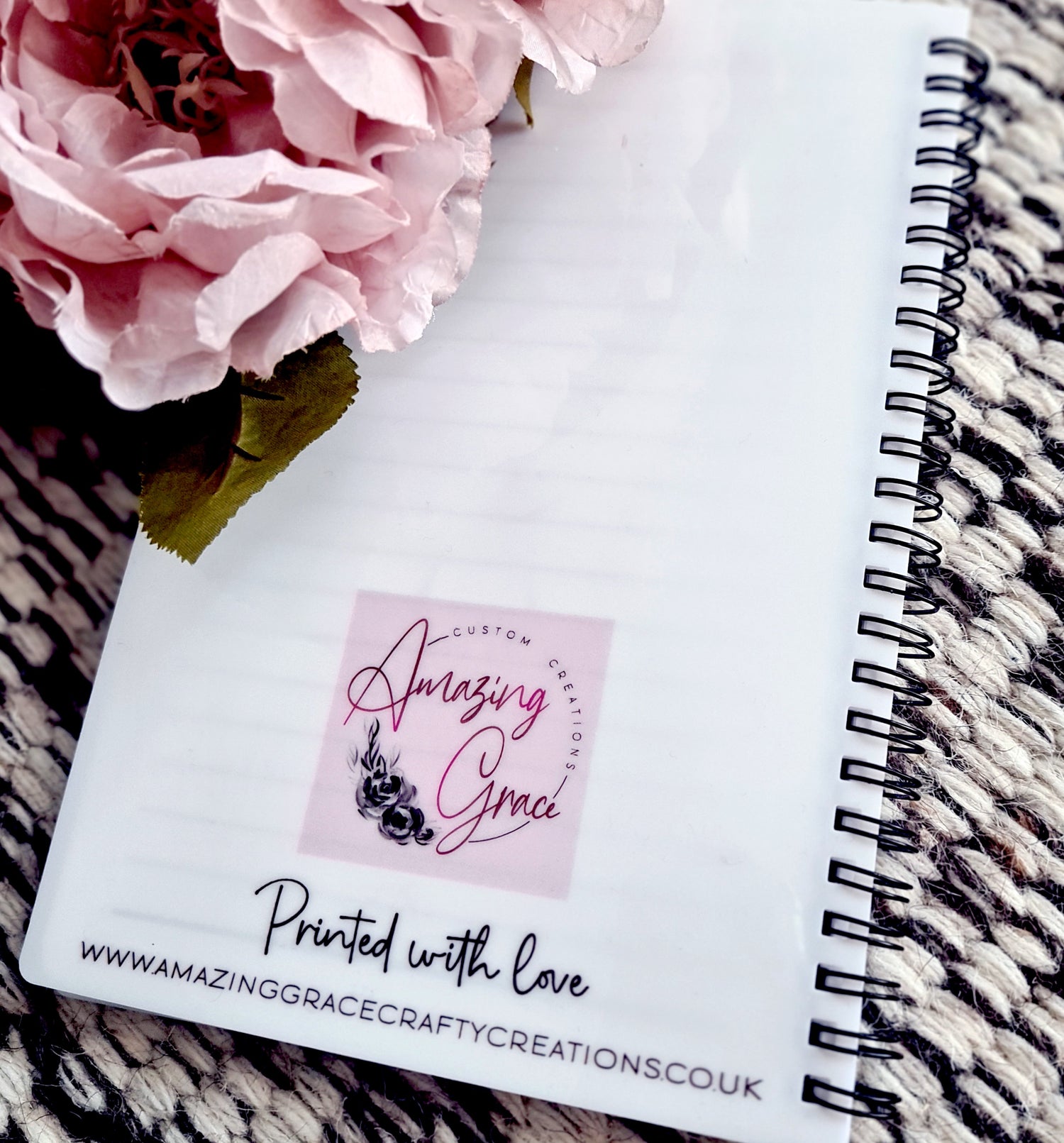 Super smart semi opaque plastic cover A5 ruled notebook, hand printed with a catchy design.