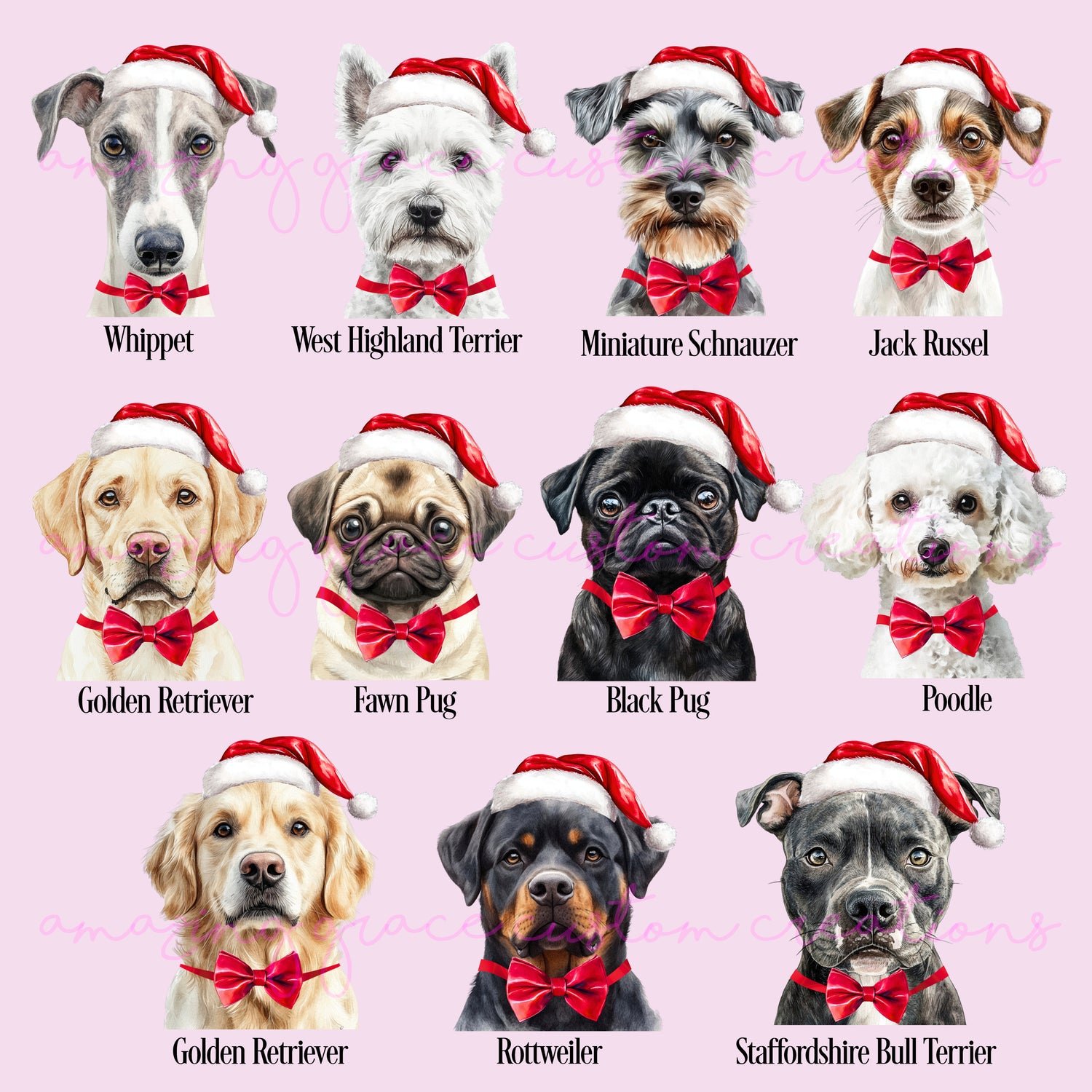 Comfy soft cotton unisex fit t-shirt, sweatshirt or hoodie with inner lining brush back fleece.... super cosy! Christmas dog themed print. Please note, if you do not see a breed that you are looking for, please contact me to see if we can sort it for you!