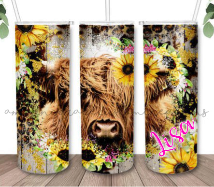 Highland cow print personalised steel tall 20oz hot/cold drinks tumbler
