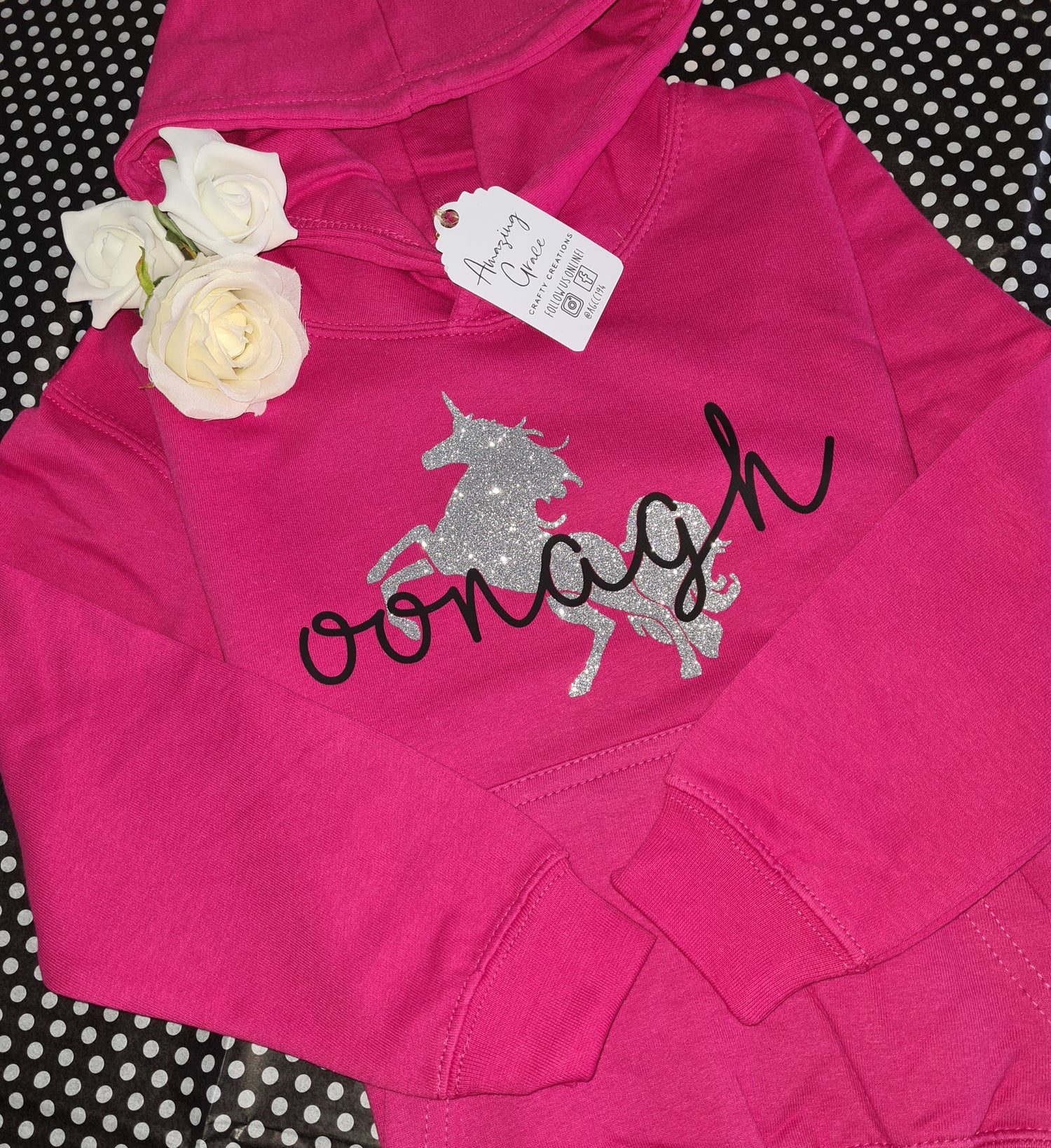 Comfy, soft touch hoody with soft brush fleece inner lining. Featuring a stunning glitter unicorn design and personalised with child's name.
