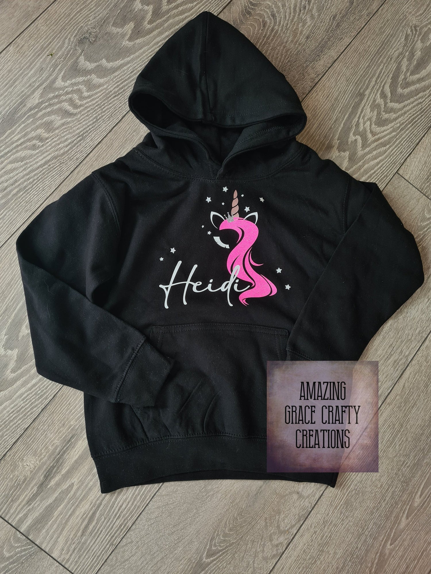 Comfy, loose fit hoodie, with soft fleece inner. Featuring a stunning unicorn design and personalised with child's name.
