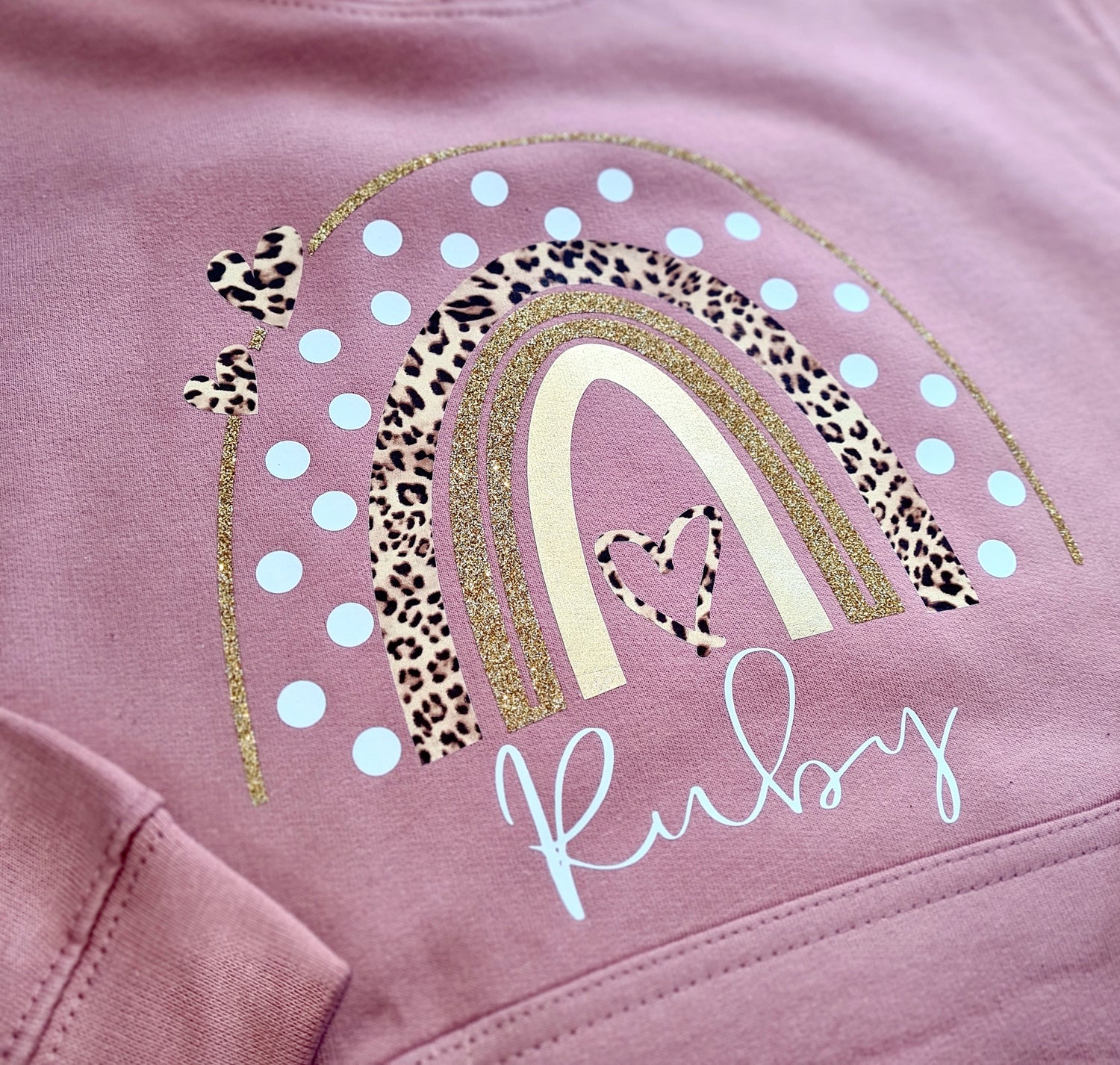 Minimalist style hoody, featuring brand new leopard print & gold glitter rainbow design.