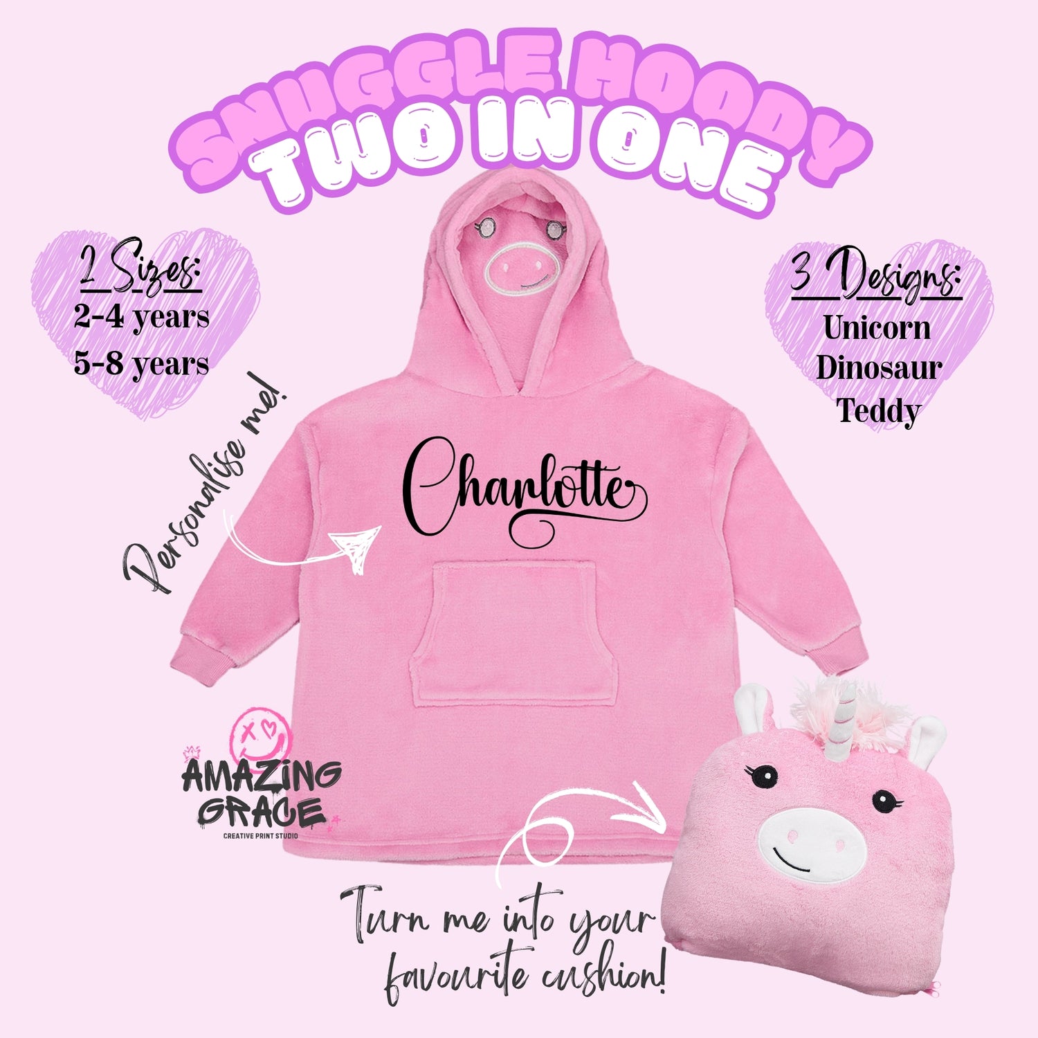 It's time to relax in style in our gorgeously soft oversize fleece snuggle blanket hoodies, with cuffed sleeves and comfort pocket. Decorated with your child's name for that special touch. Choose from a Unicorn, Dinosaur or Teddy design.