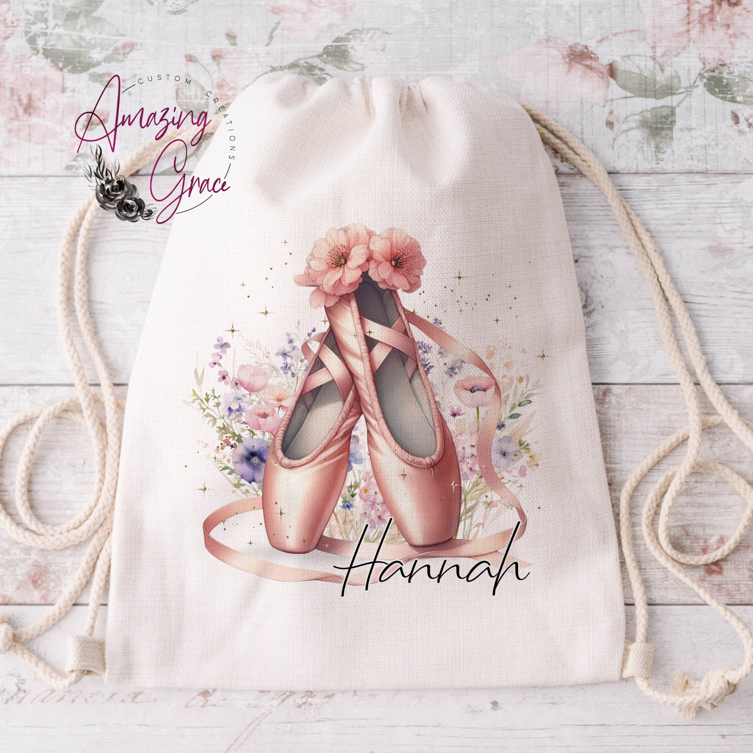 Linen feel drawstring bag - Floral ballet, personalised