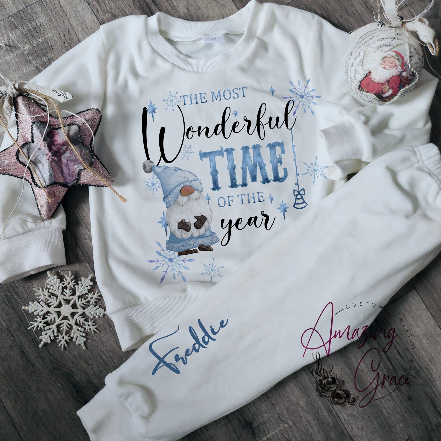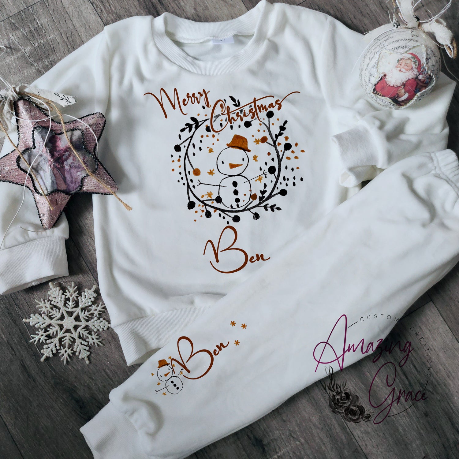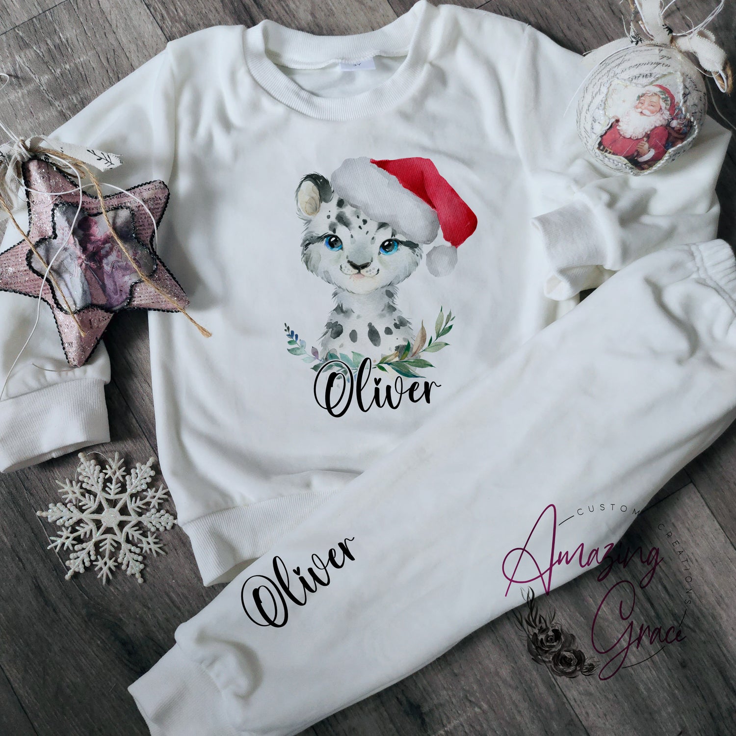 Stunning children's personalised lounge set available in a range of different Christmas designs. Super soft white velour fabric, perfect for Christmas chills!