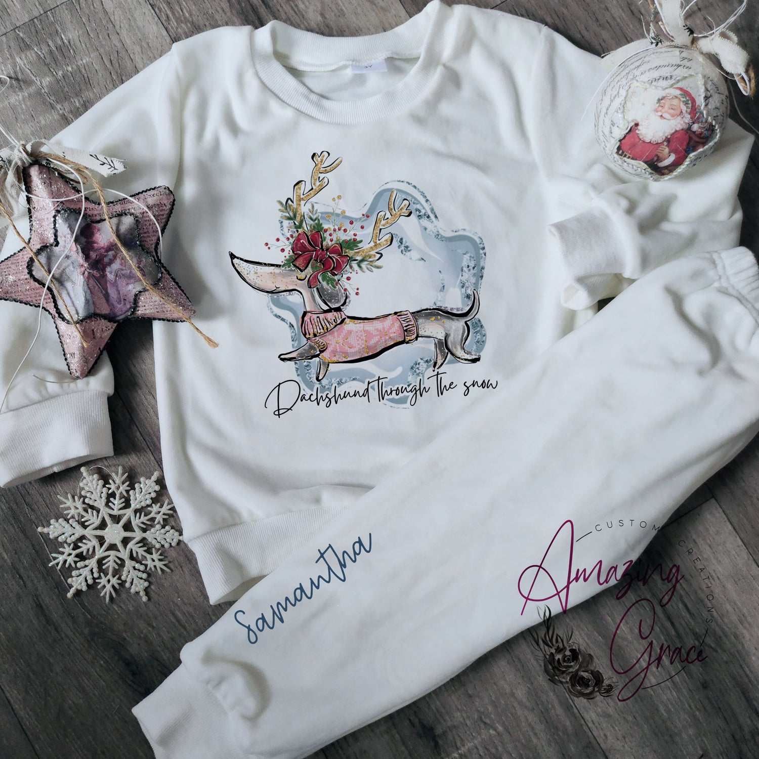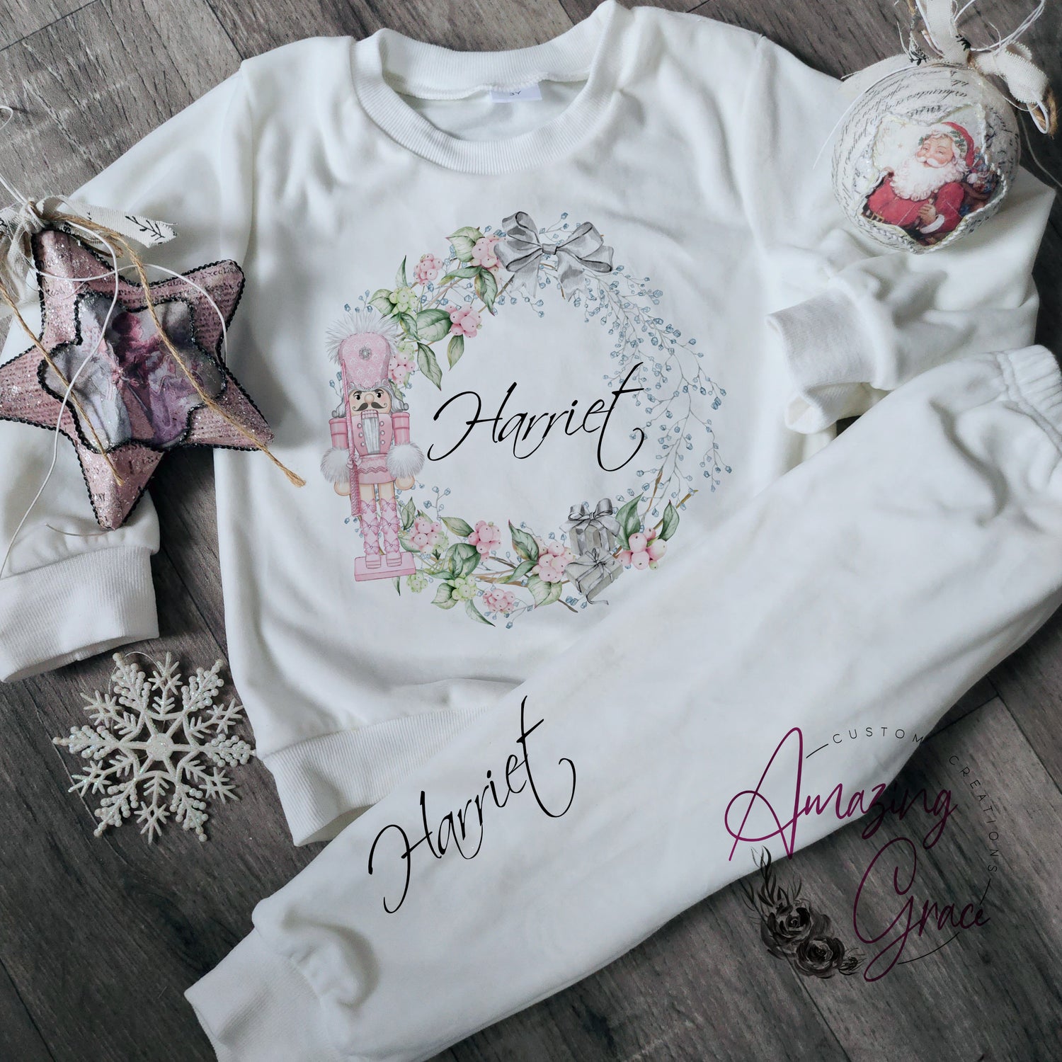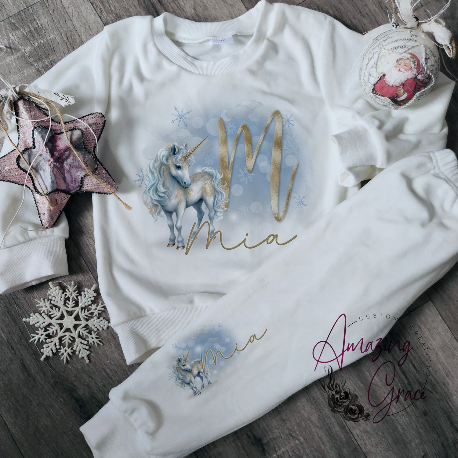 Stunning children's personalised lounge set available in a range of different Christmas designs. Super soft white velour fabric, perfect for Christmas chills!
