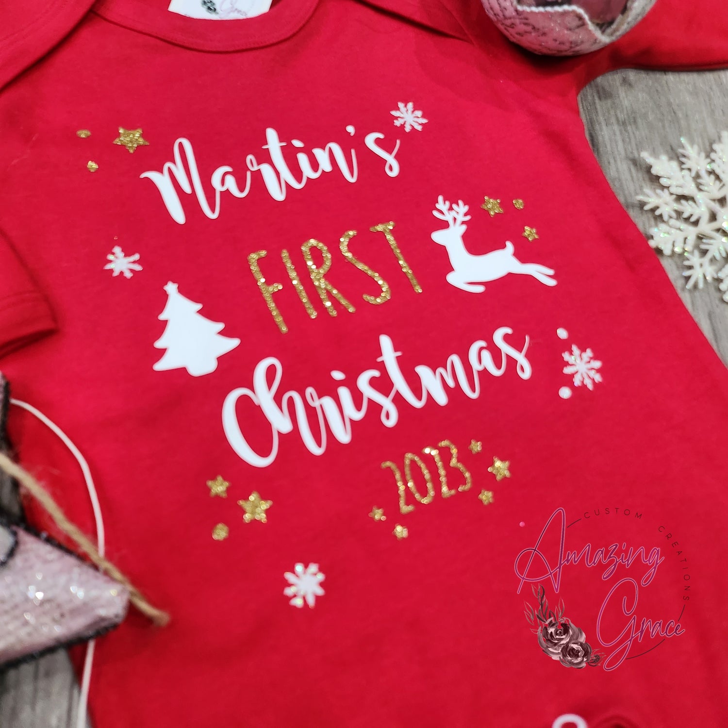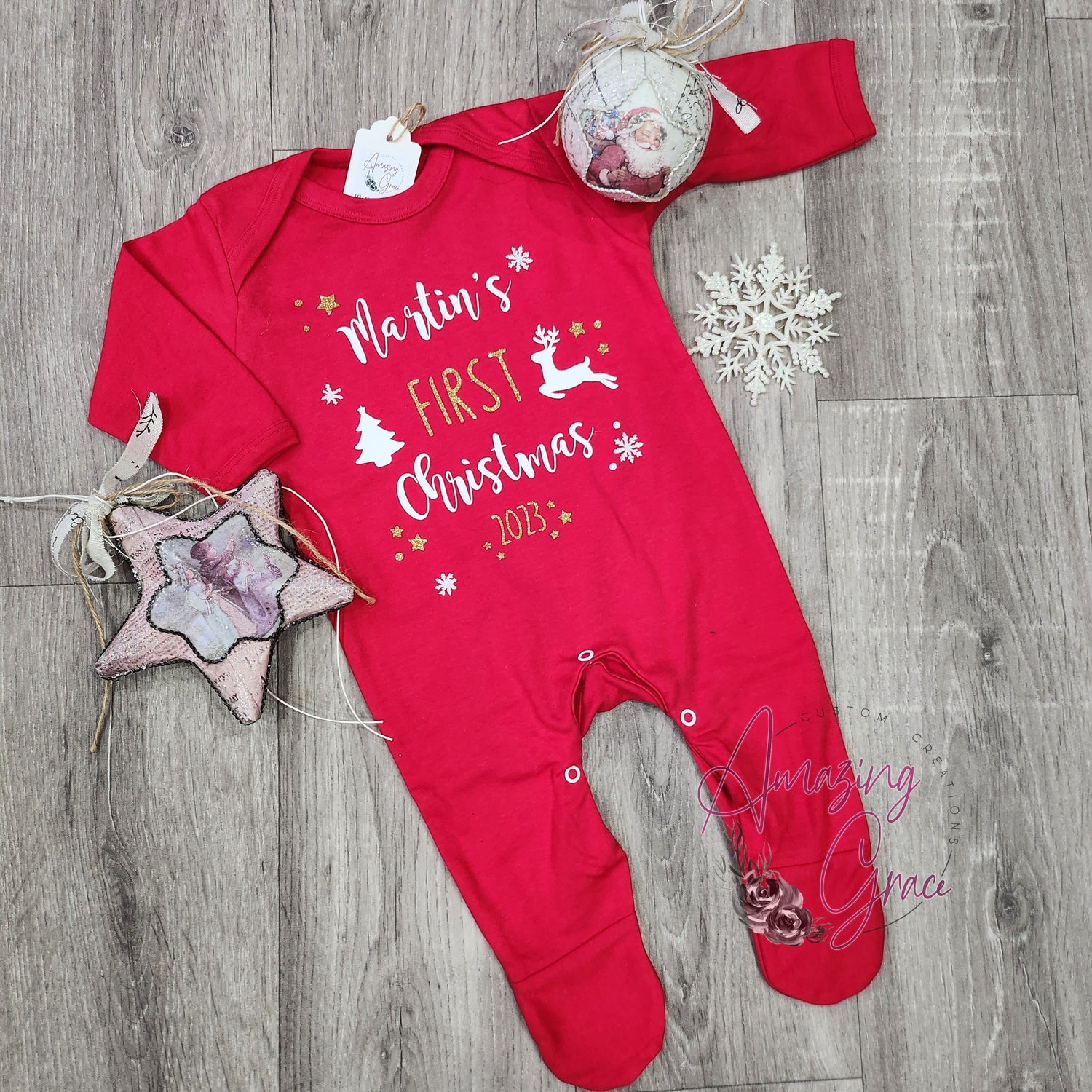 Beautiful, red sleep suit with an eye catching design, personalised with your child's name to celebrate their first Christmas!