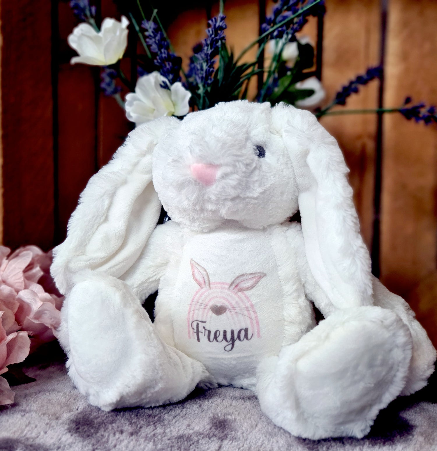 Hand personalised using a specialist printing format to give a smooth finish making a special keepsake which complies with the EN71 European toy safety regulations. These are floppy bunnies and have full tummy’s but floppy (not full) limbs. Approx 24cm