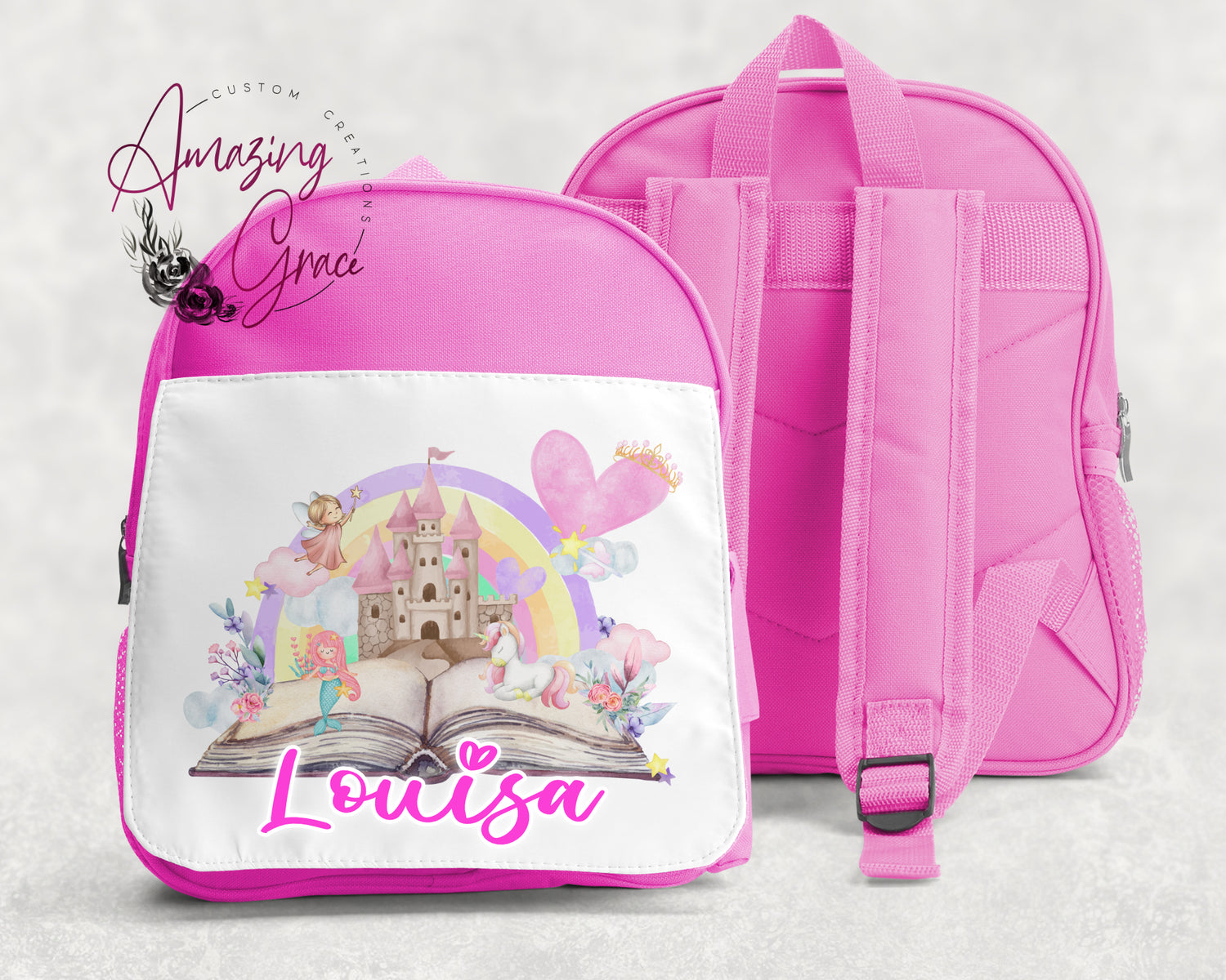 This is our gorgeous selection of colourful and practical backpacks, personalised with a gorgeous fairytale print. Our bags sit approx 30cm tall, 26cm wide and 9cm deep, these beauties are ideal for the younger primary school/preschool/nursery starters .... spacious and roomy without being too big, featuring a separate front section, zip pockets and elasticated side sections. They come in a gorgeous set of colours inc hot pink, royal blue, sunflower yellow and lime green.Please note, personalised items are NOT eligible for returns/exchanges.