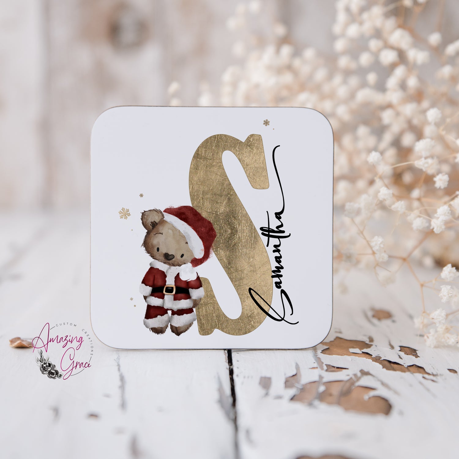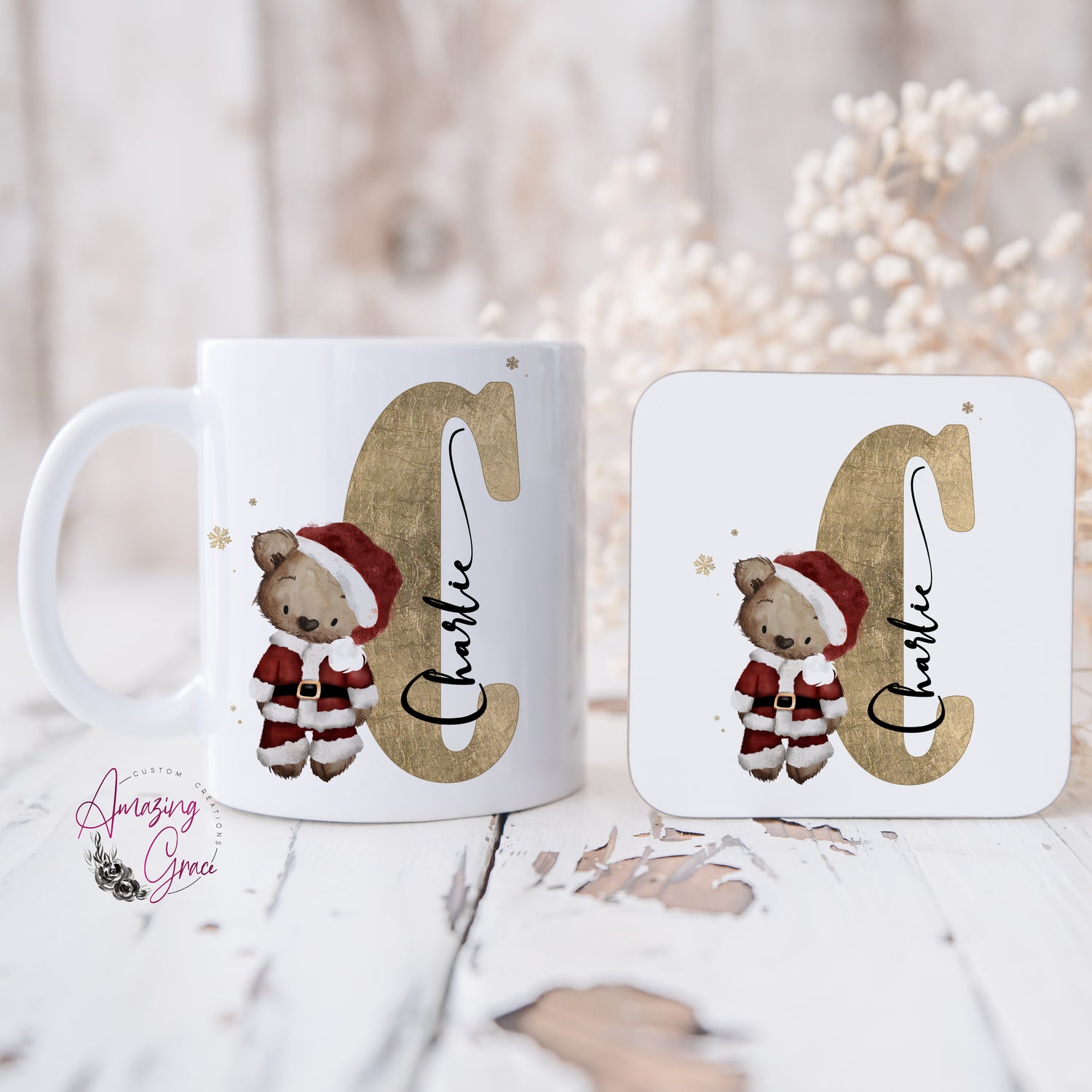 Ceramic mug decorated with teddy initial print & name, printed both sides. With optional matching coaster