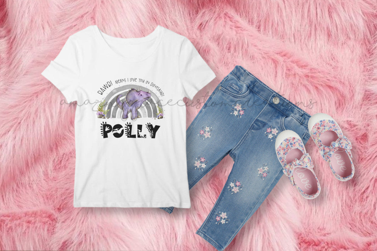 Soft, white 100% polyester short sleeve tshirt featuring printed Dinosaur design
