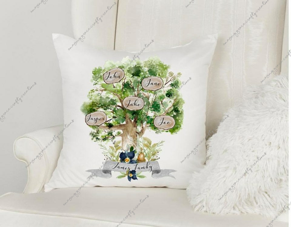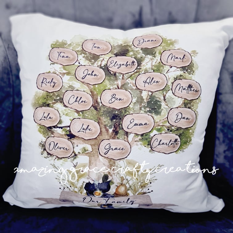 Tree design will fit up to 18-20 names and pressed onto soft, quality white 100% polyester cushion covers with a vibrant, direct print which will not fade/crack