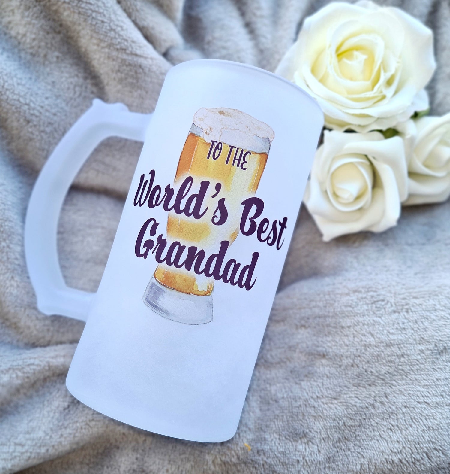Stunning frosted beer steins decorated with a personalised fathers day design.