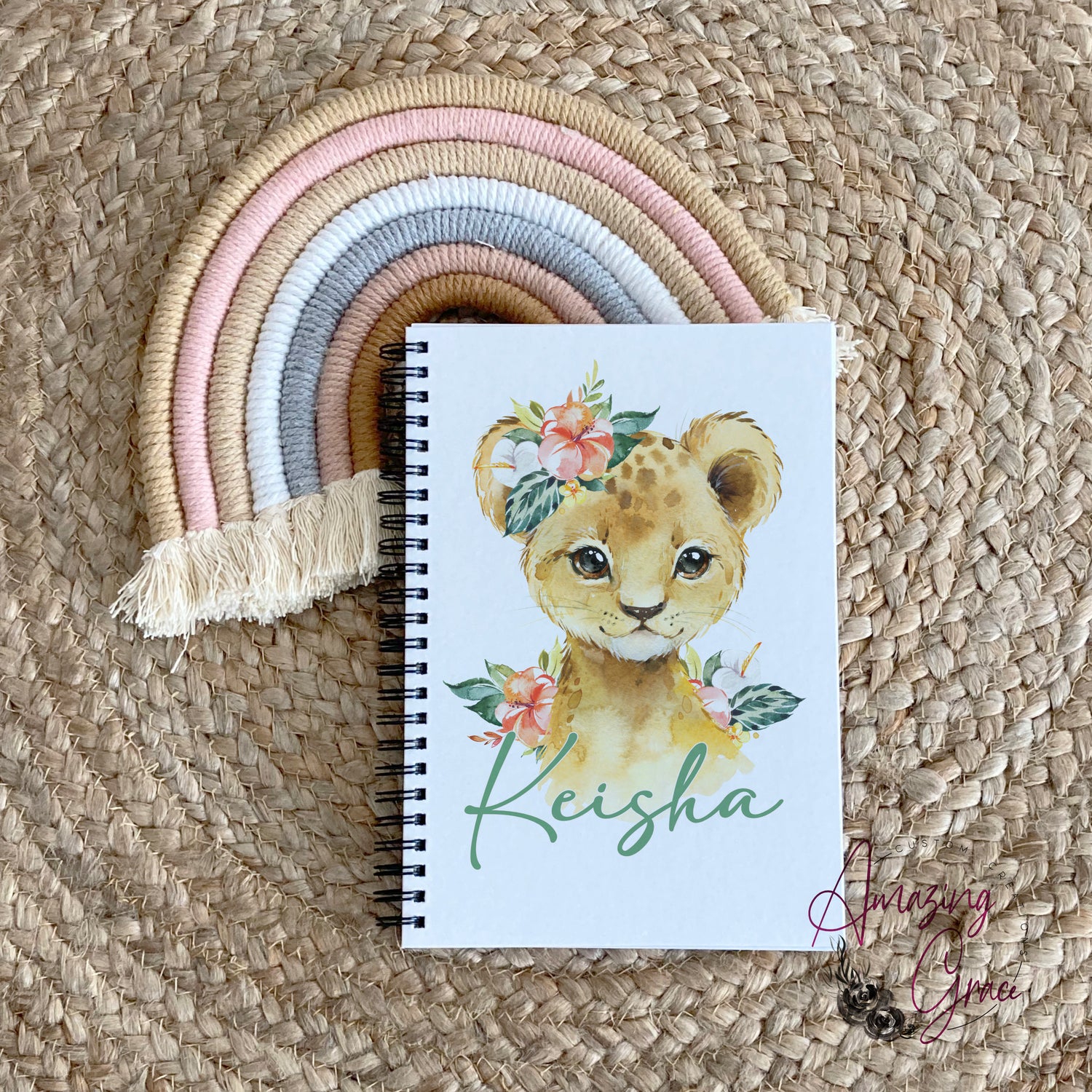 Super smart plastic cover A5 ruled notebook, hand printed with a personalised lion cub