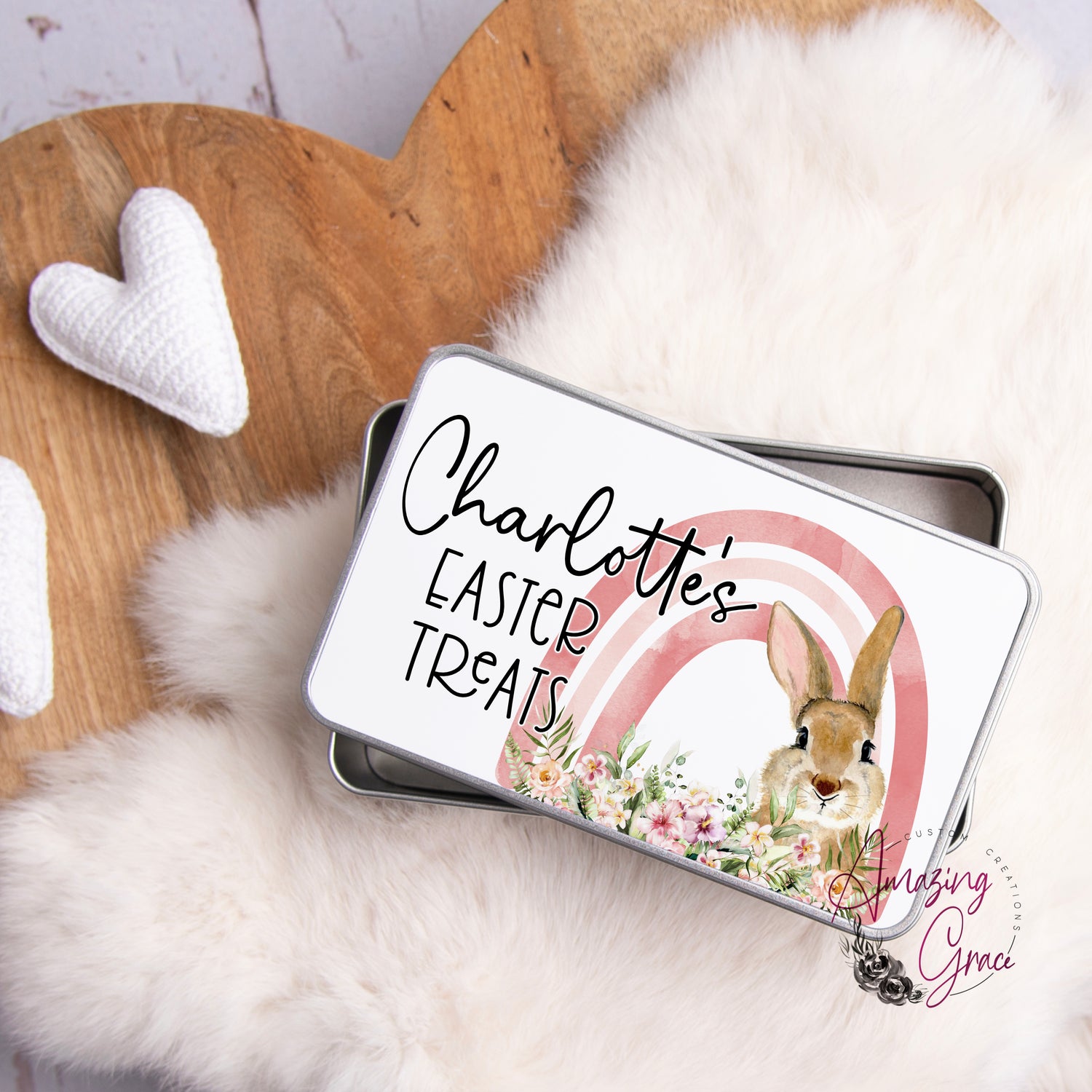 Metal tin to store your Easter treats! Personalised with your name and cute floral rabbit illustration printed onto lid.