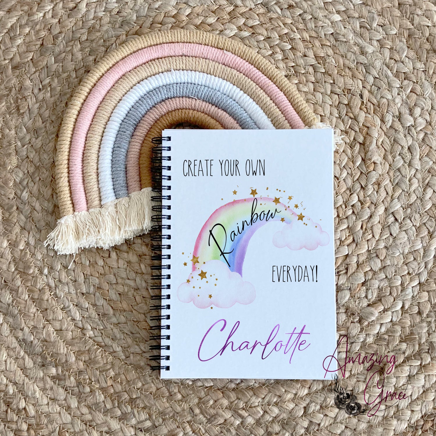 Super smart plastic cover A5 ruled notebook, hand printed with a personalised rainbow design