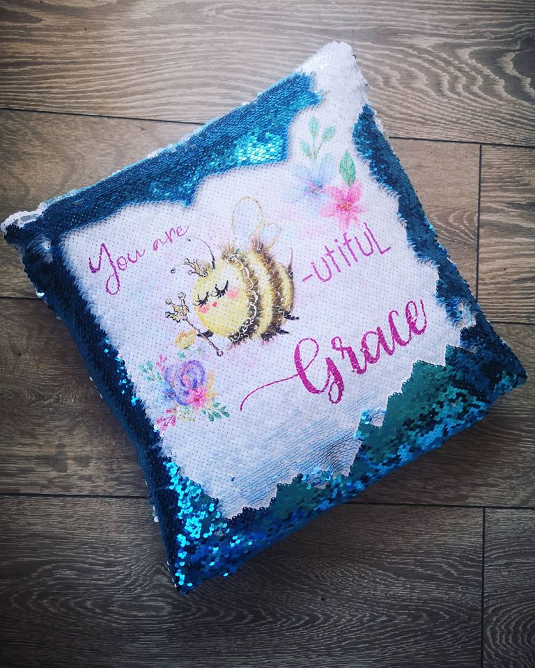 Beautifully bright and vibrant sequin cushions with personalised artwork on the reverse side of the sequins. Perfect for any little girls bedroom!