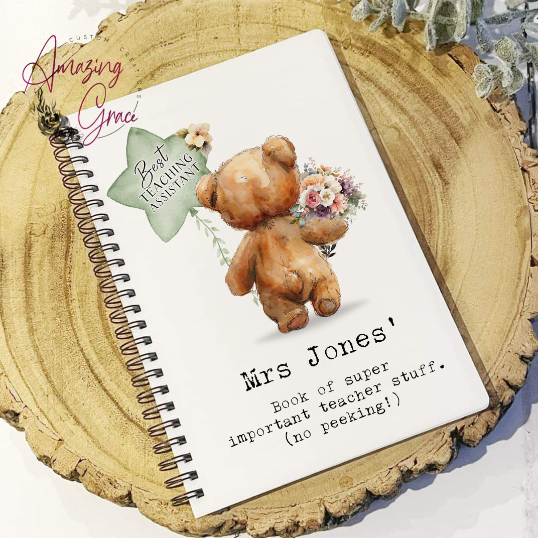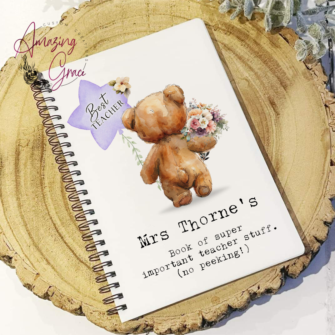A teacher notebook is an ideal gift for end of term and here we have a super smart plastic cover A5 ruled notebook, hand printed with a personalised teacher design