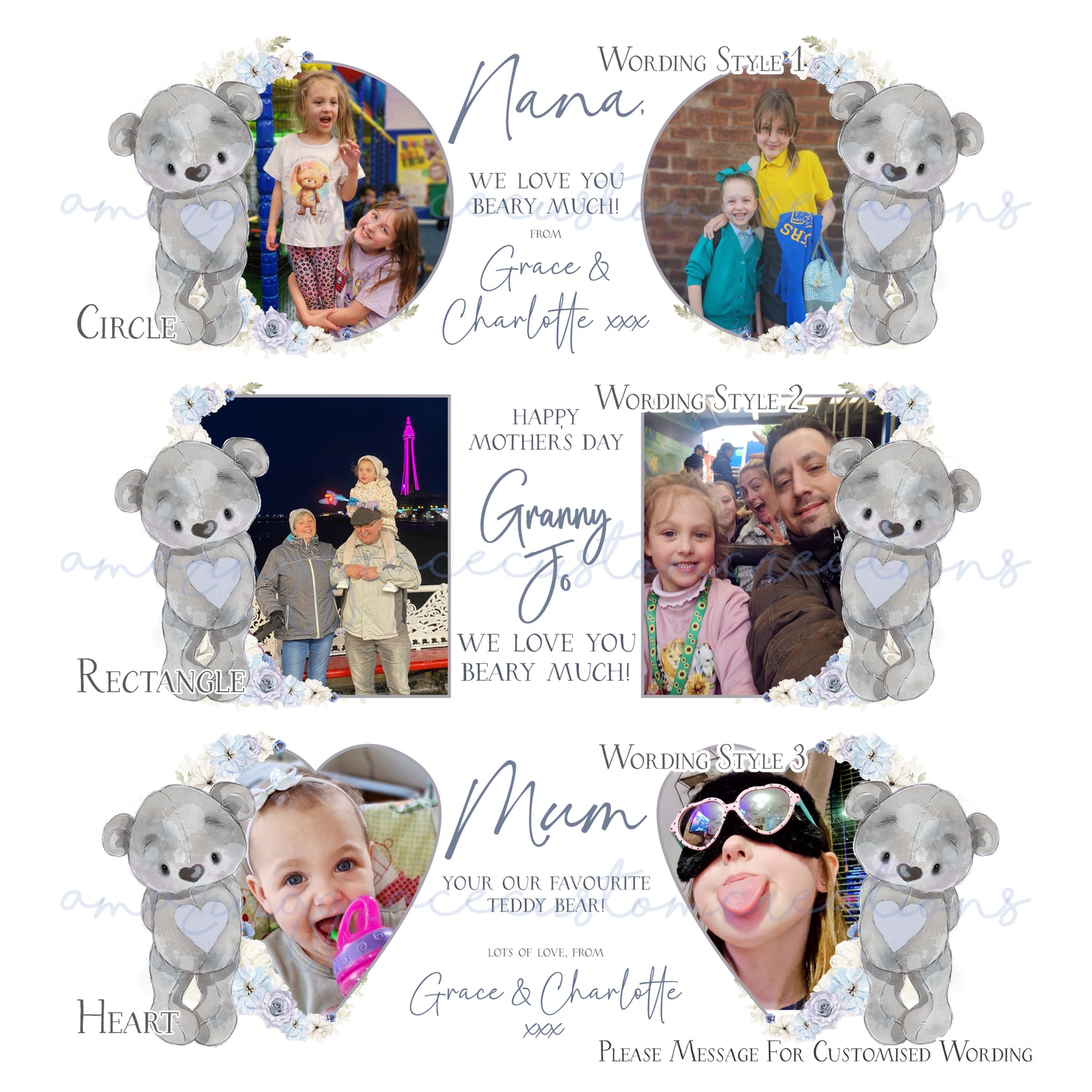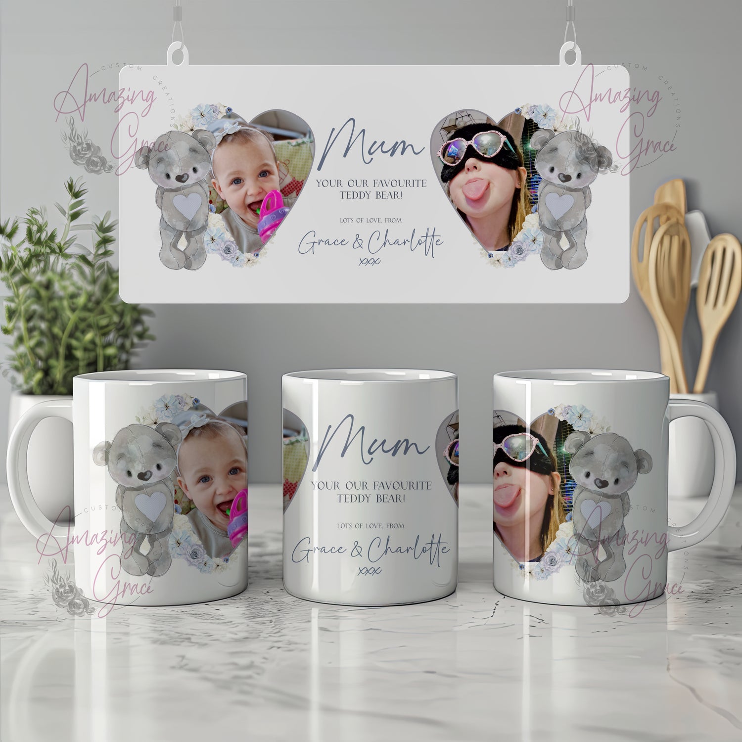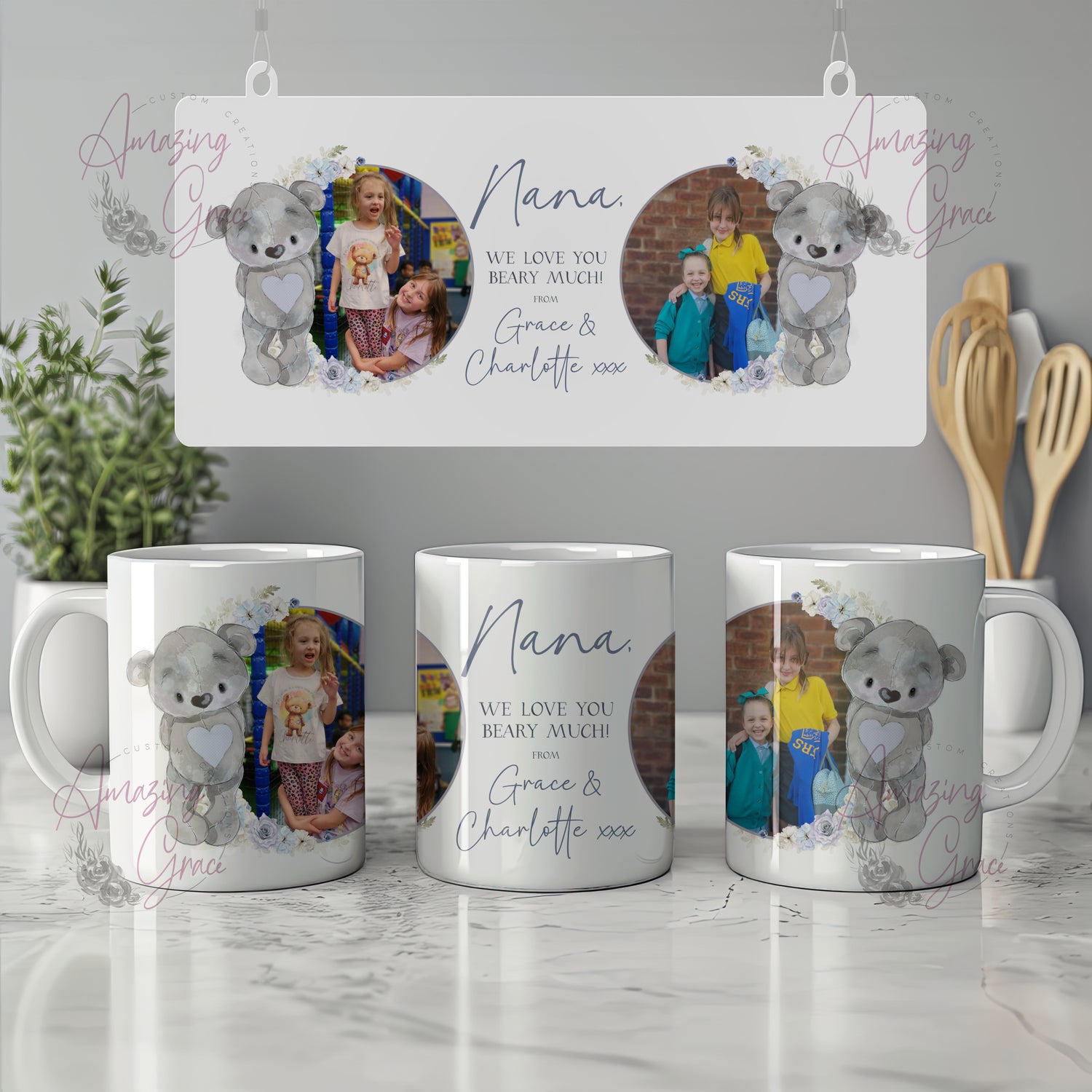 11oz Ceramic mug decorated with beautiful watercolour floral bear design with personalised text and photo