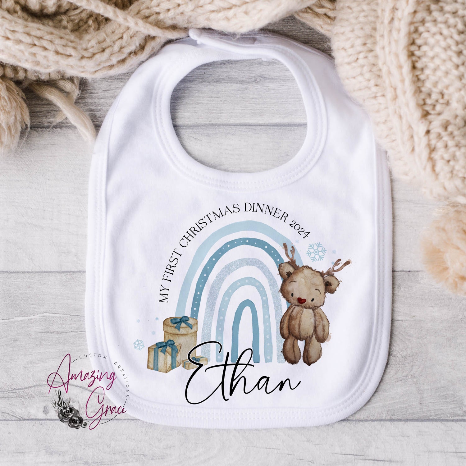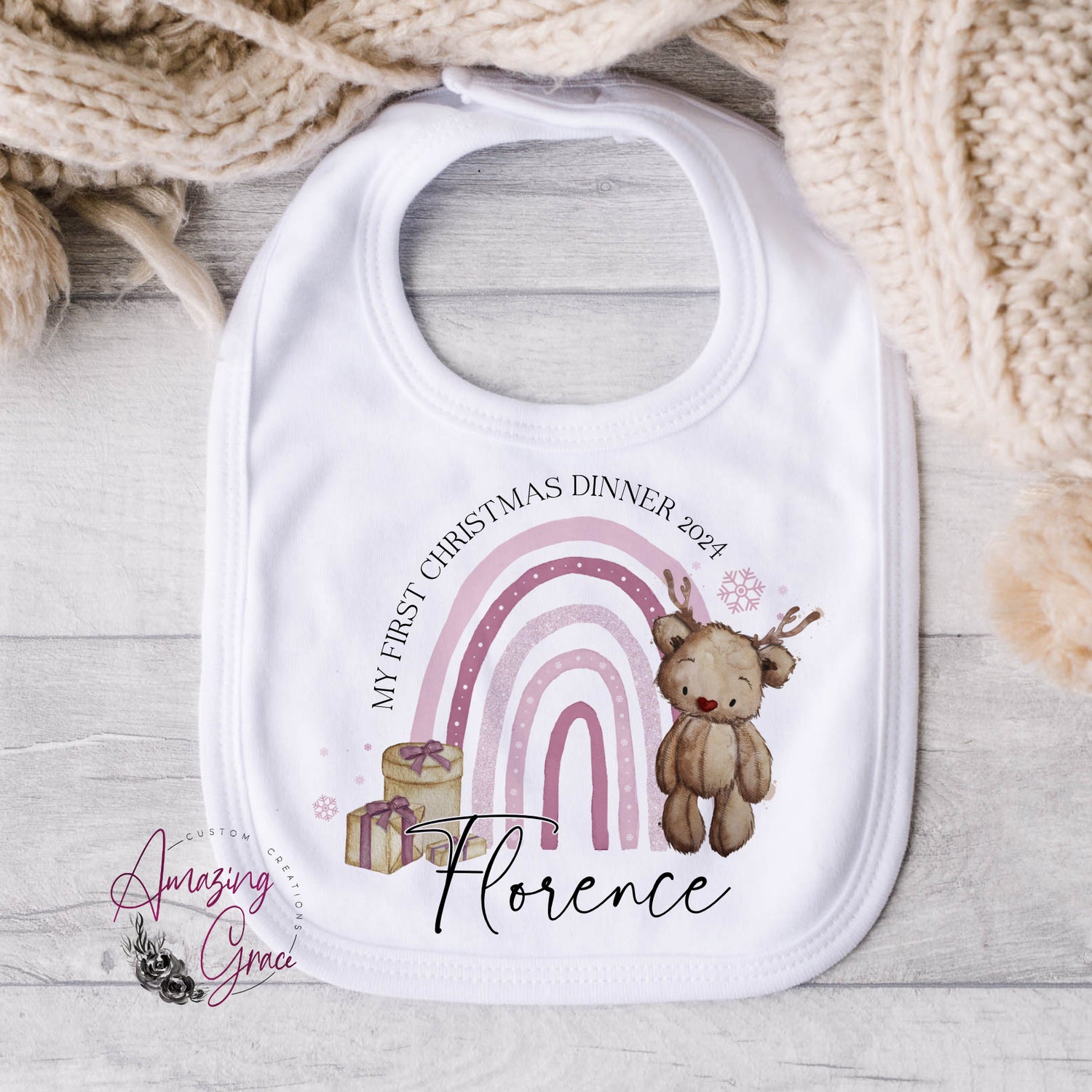 Beautiful soft touch bib with a lovely 2024 design, personalised with your child's name to celebrate their first Christmas Dinner!