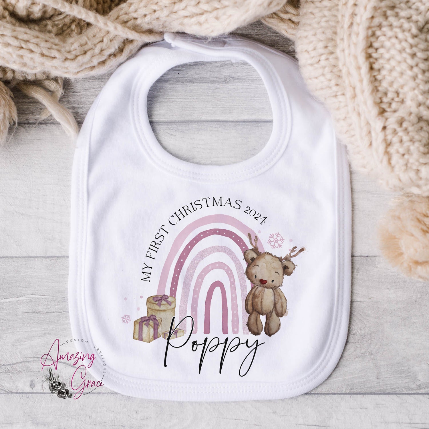 Beautiful soft touch vest or sleep suit with a stunning, unique rainbow "reinbear" design, personalised with your child's name to celebrate their first Christmas!
