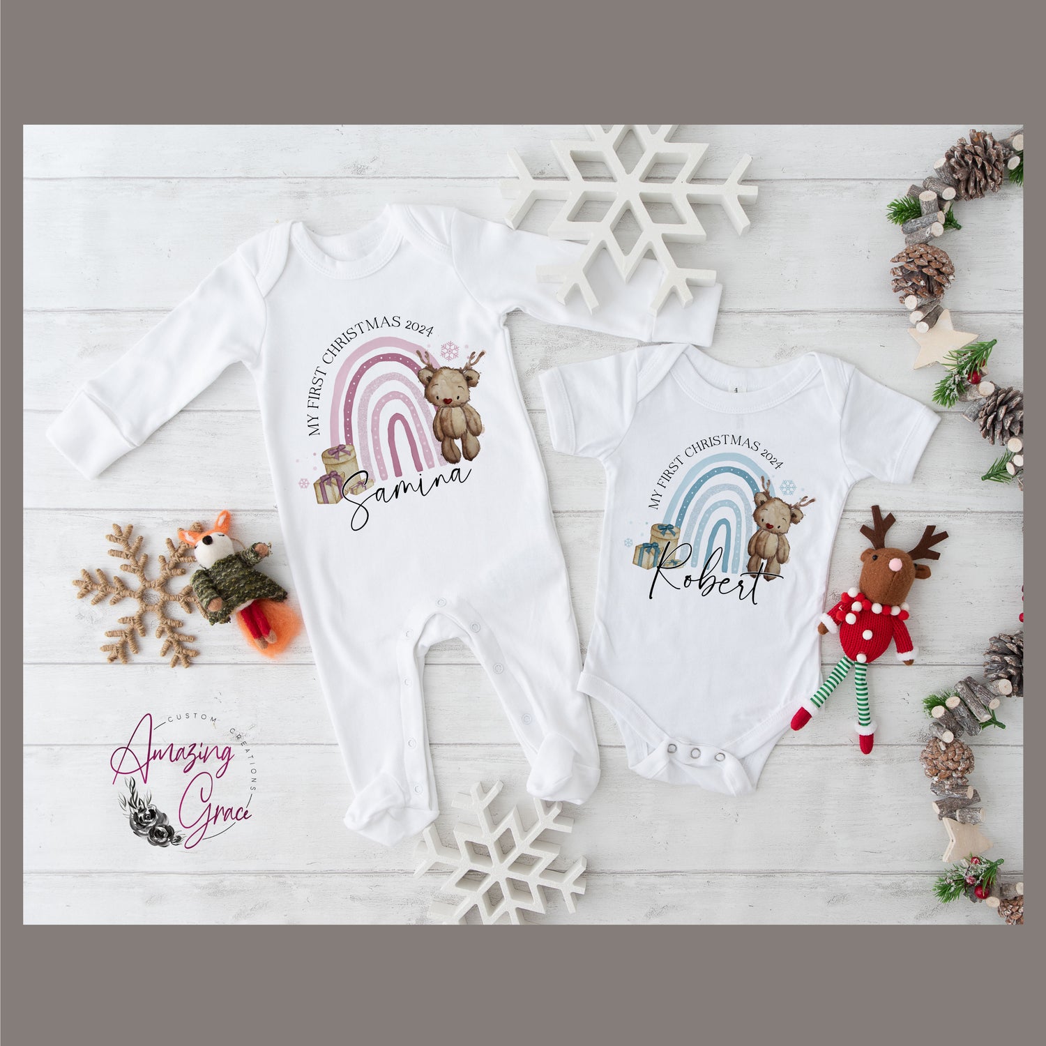RAINBOW BEAR - 1st Christmas Baby Grow / Sleepsuit