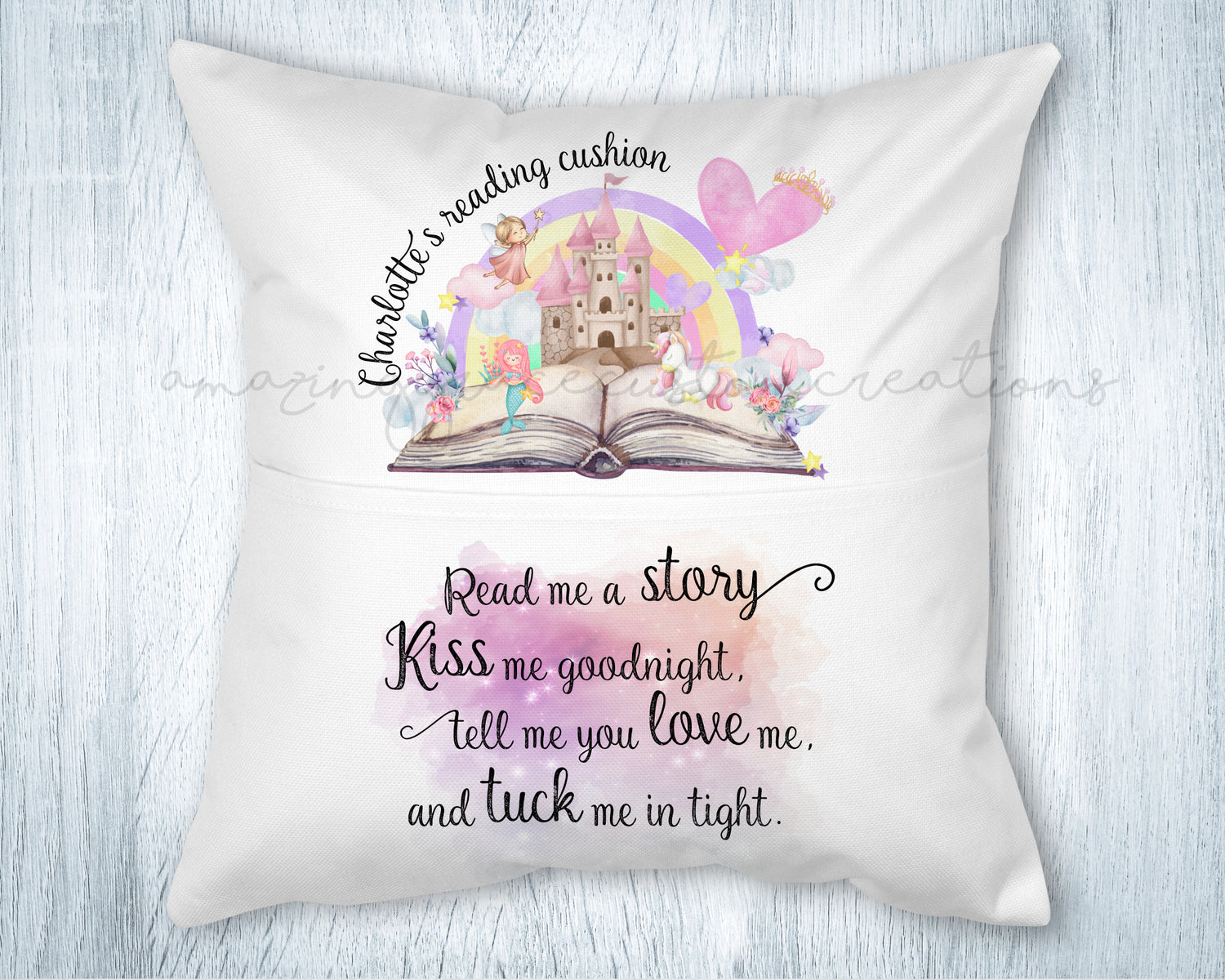 Beautifully designed personalised reading pocket cushion, personalised with your little ones name. Perfect for storing their favourite bed time read!