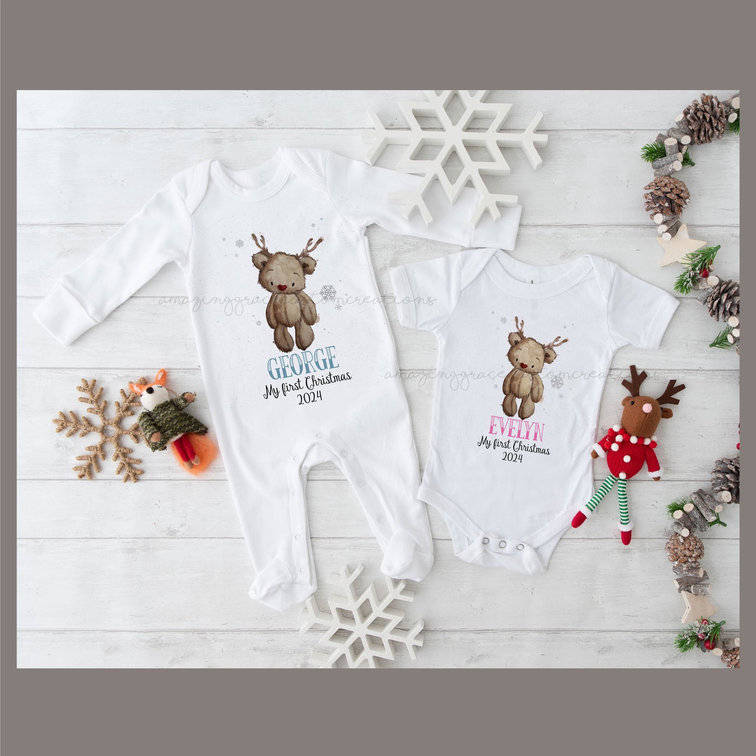 Beautiful soft touch vest or sleep suit with a stunning, unique "reinbear" design, personalised with your child's name to celebrate their first Christmas!
