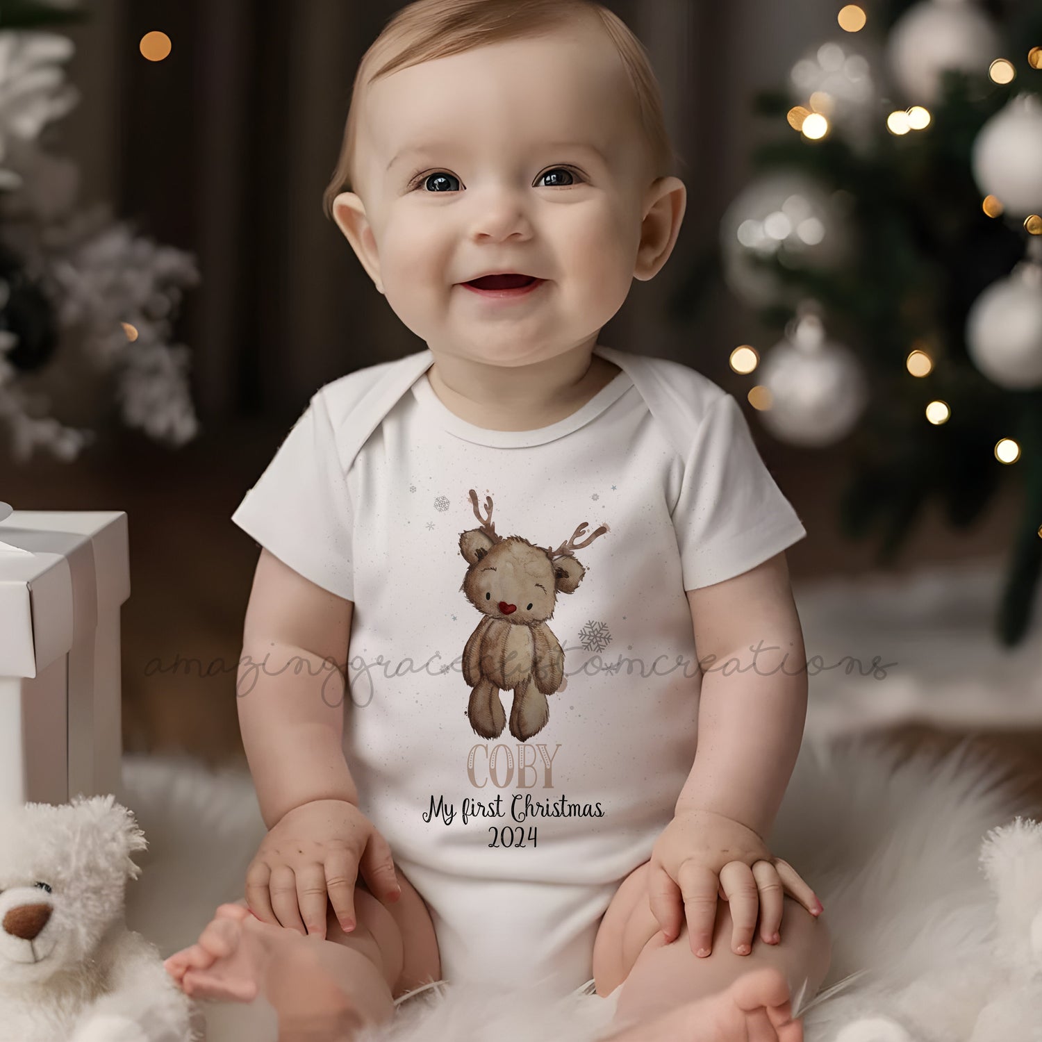 Beautiful soft touch vest or sleep suit with a stunning, unique "reinbear" design, personalised with your child's name to celebrate their first Christmas!