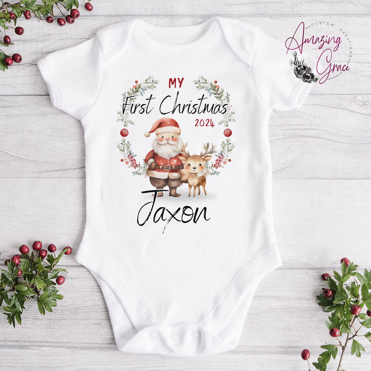 Beautiful soft touch vest or sleep suit with a lovely 2024 design, personalised with your child's name to celebrate their first Christmas!