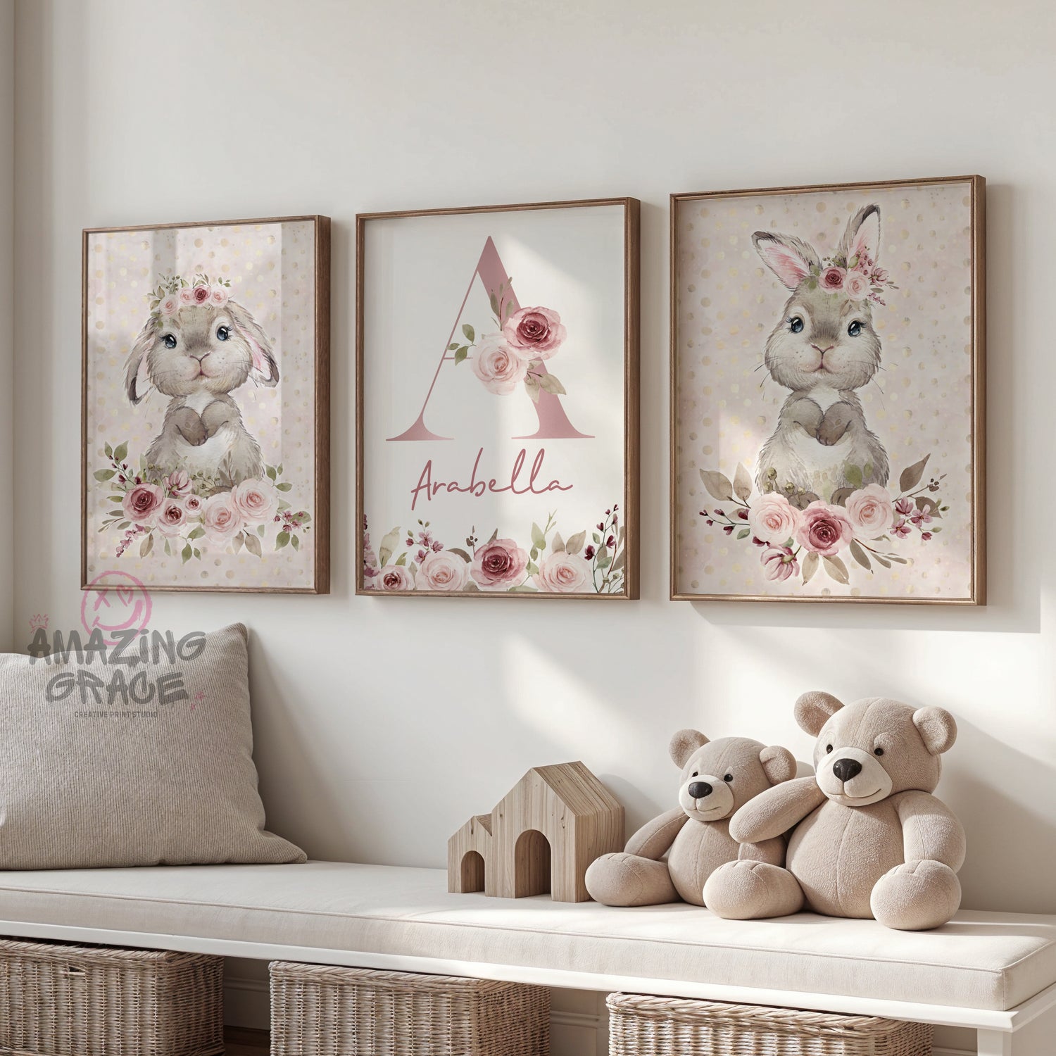 Set of 3 Personalised A4 nursery print - boho floral bunny
