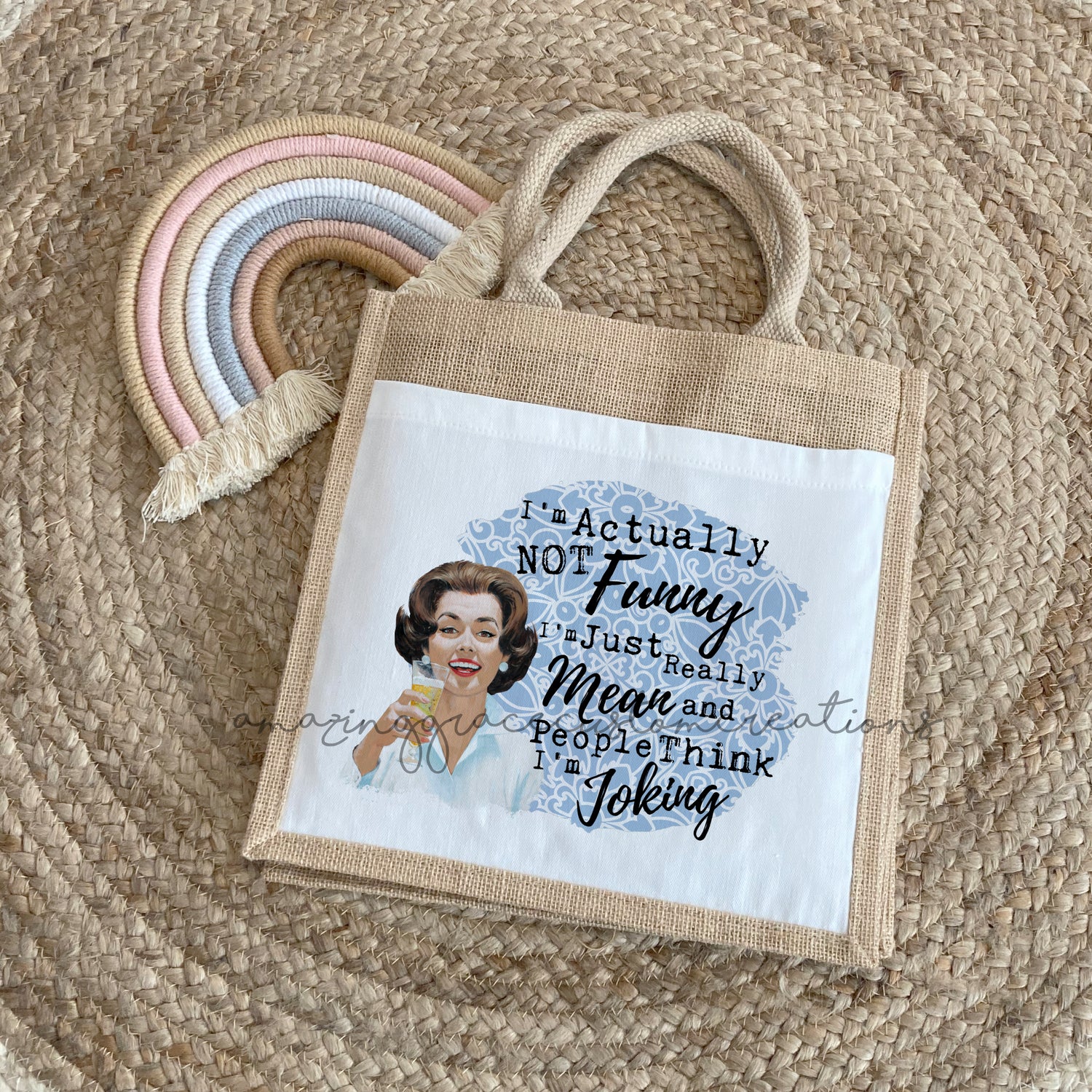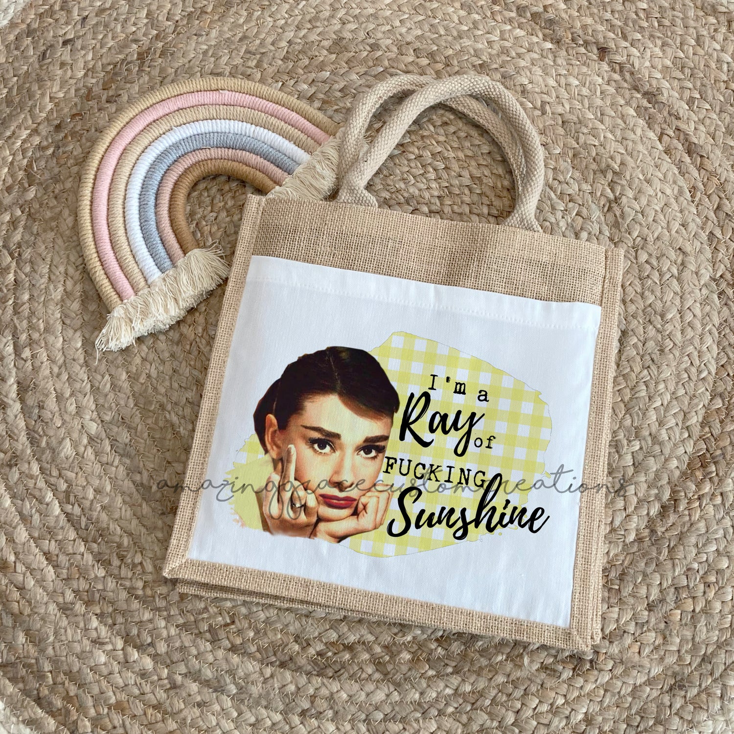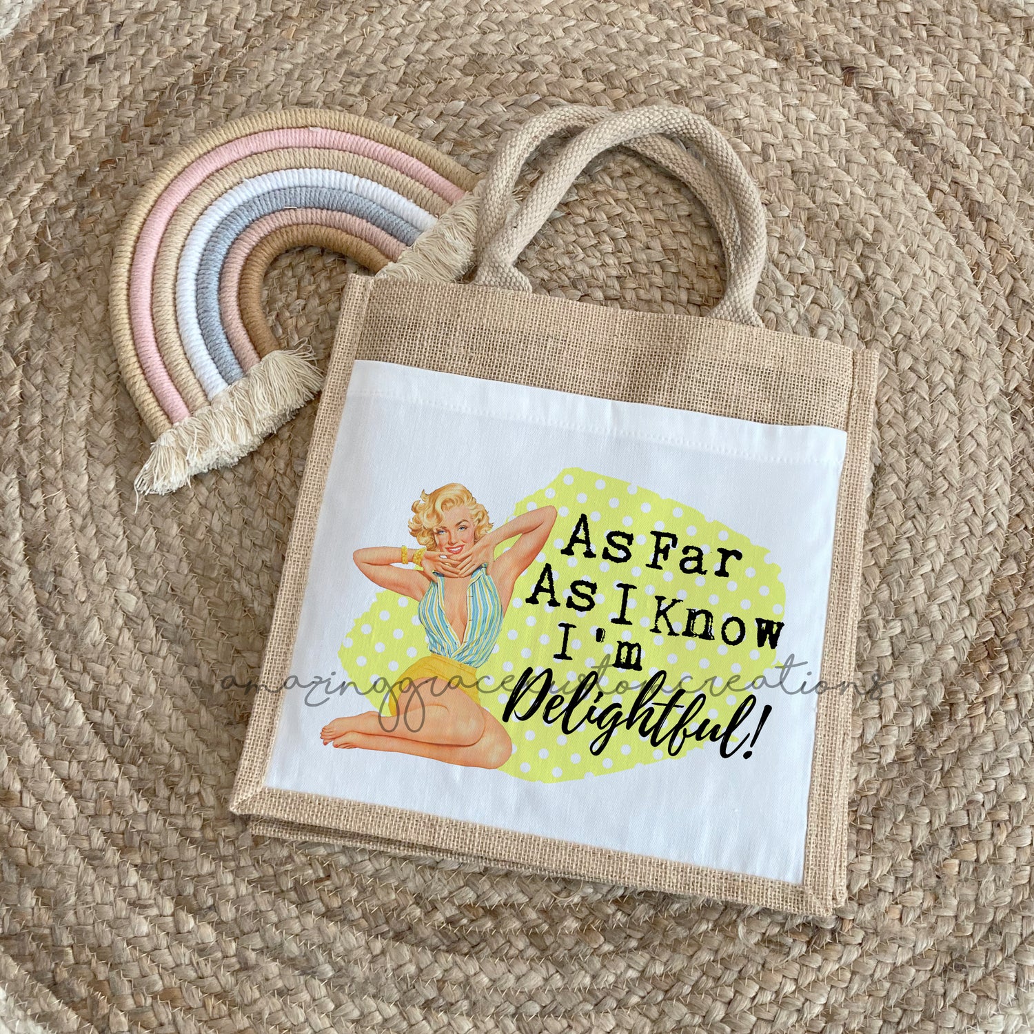 Gorgeous and eye catching... Reusable, handled jute bag 20cm x 20cm x 10cm in size.